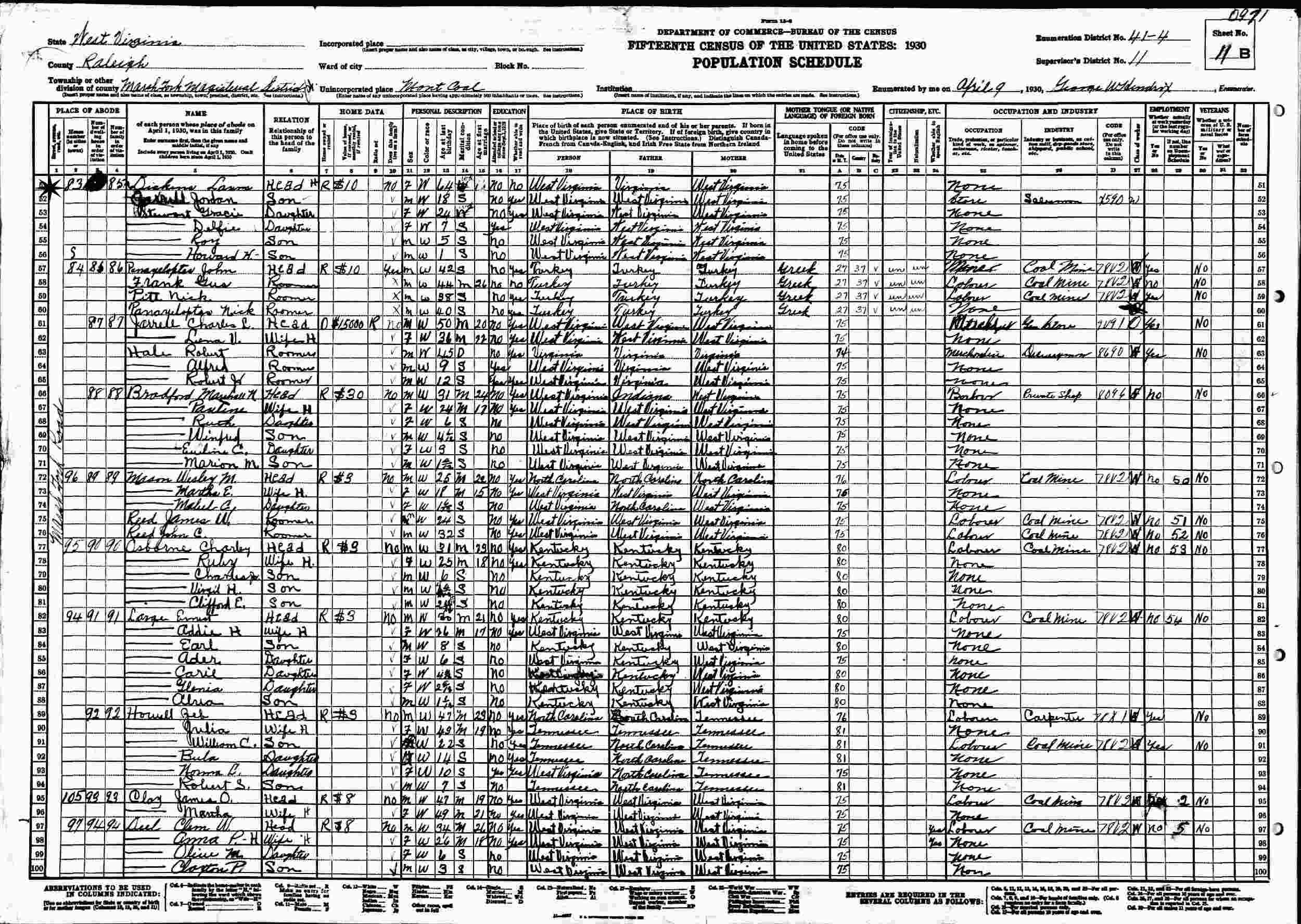 April 9, 1930 - Supervisor's District 11, Enumeration District 41-4, Marsh Fork District, Montcoal, Raleigh County, West Virginia (w/Maternal Grandmother).
