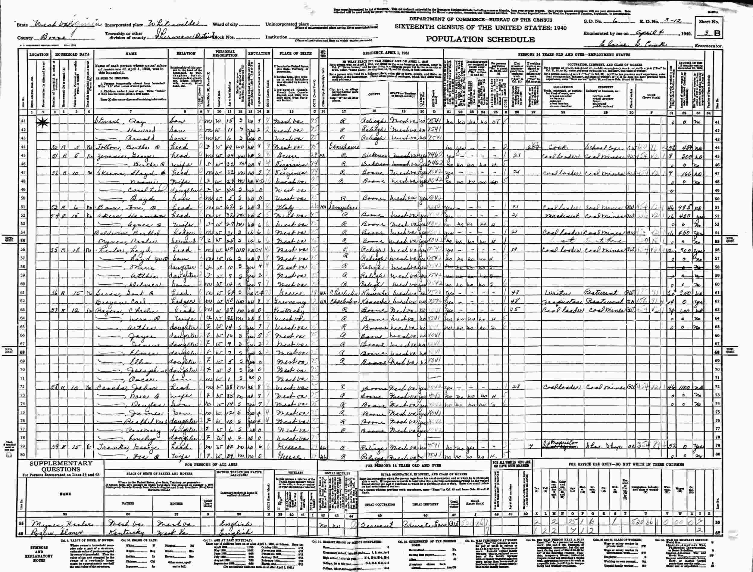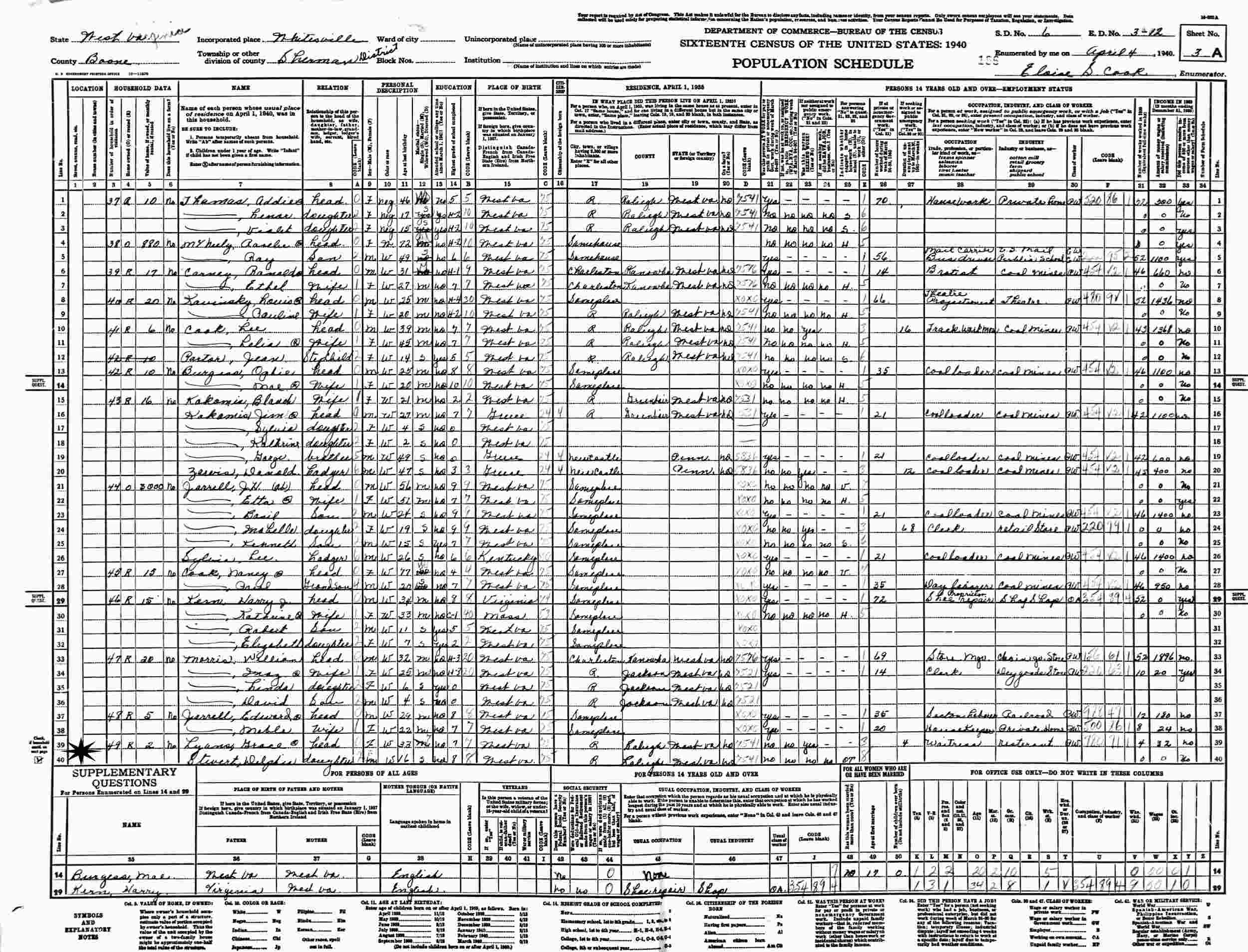 April 4, 1940 - Supervisor's District 6, Enumeration District 3-12, Sherman District, Whitesville, Boone County, West Virginia.