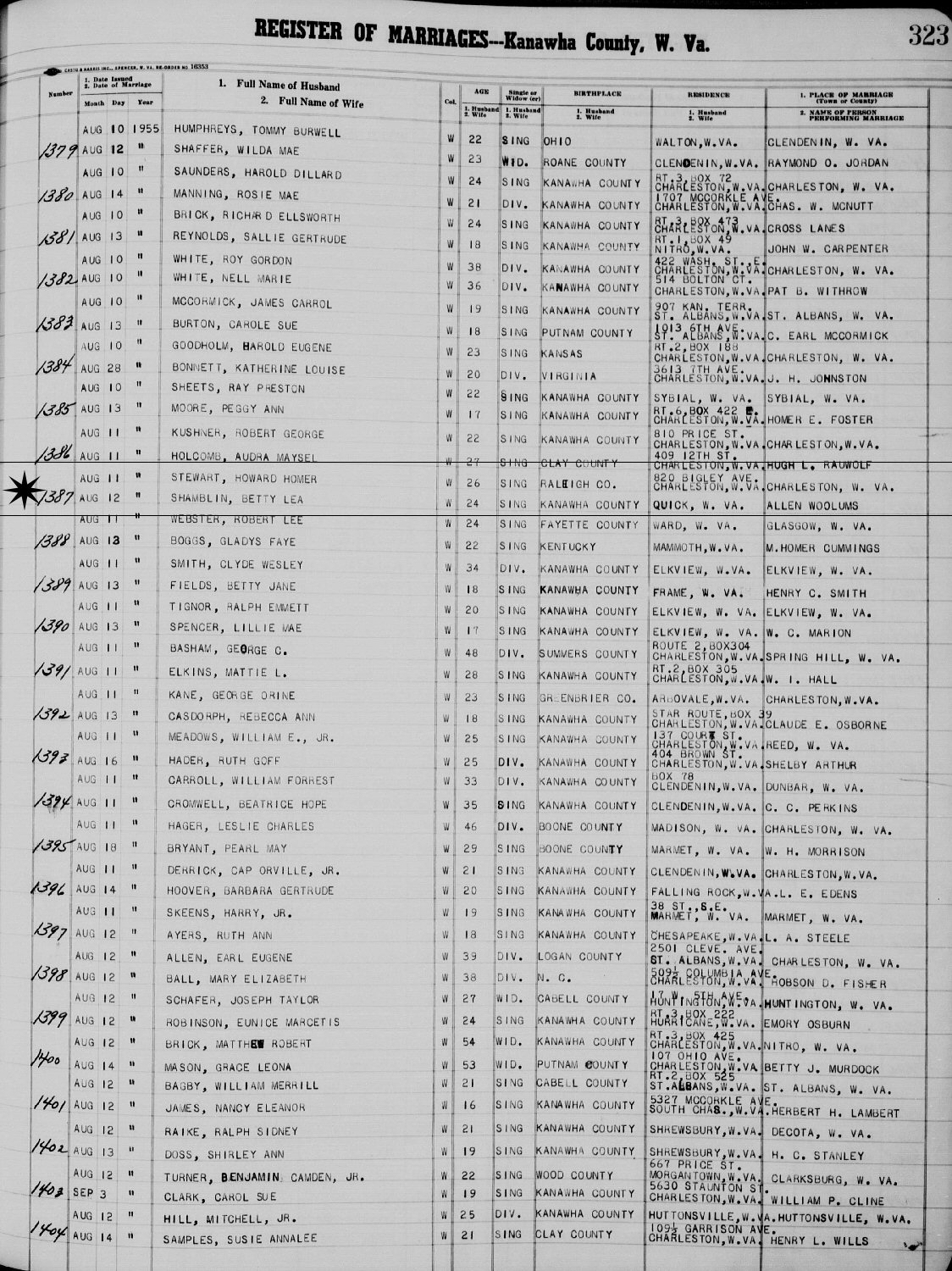 Married: Betty Lea Shamblin August 12, 1955 in Charleston, Kanawha County, West Virginia. (Marriage License: August 11, 1955.)