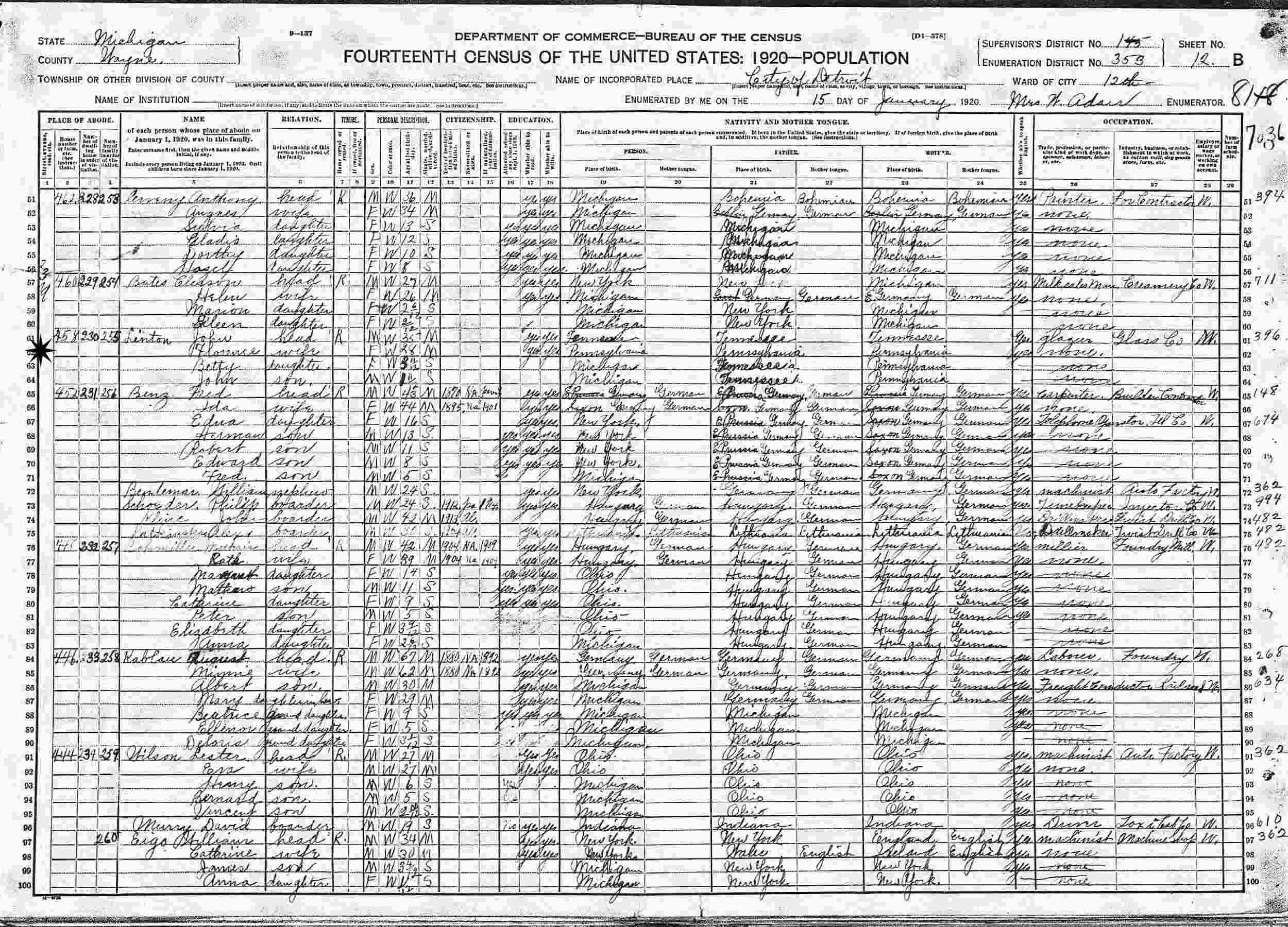 January 15, 1920 - 458 23rd, Ward 12, Supervisor's District 145, Enumeration District 343, Detroit, Wayne County, Michigan.