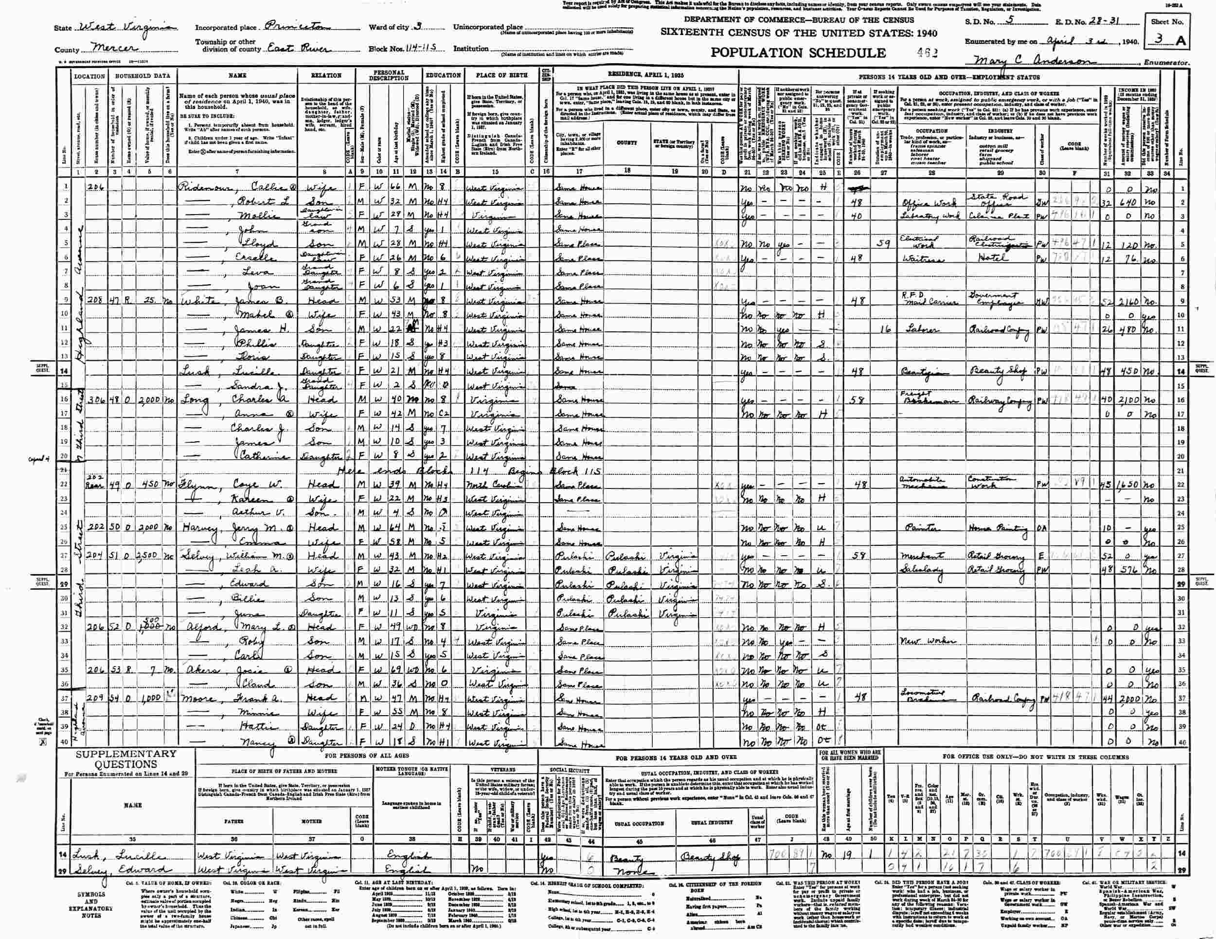 April 3, 1940 - 206 Highland Avenue, Ward 3, Blocks 114-115, Supervisor's District 5, Enumeration District 28-31, East River, Princeton, Mercer County, West Virginia.