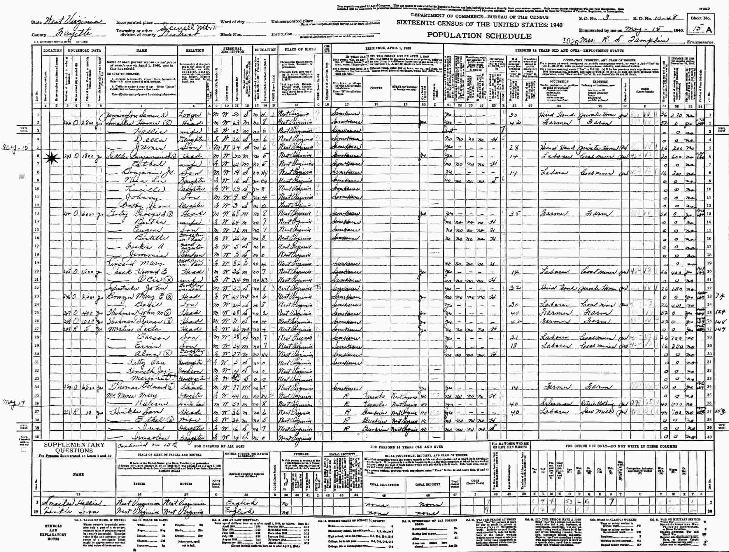 May 15, 1940 - Supervisor's District 3, Enumeration District 10-48, Sewell Mt. Magisterial District, Fayette County, West Virginia.