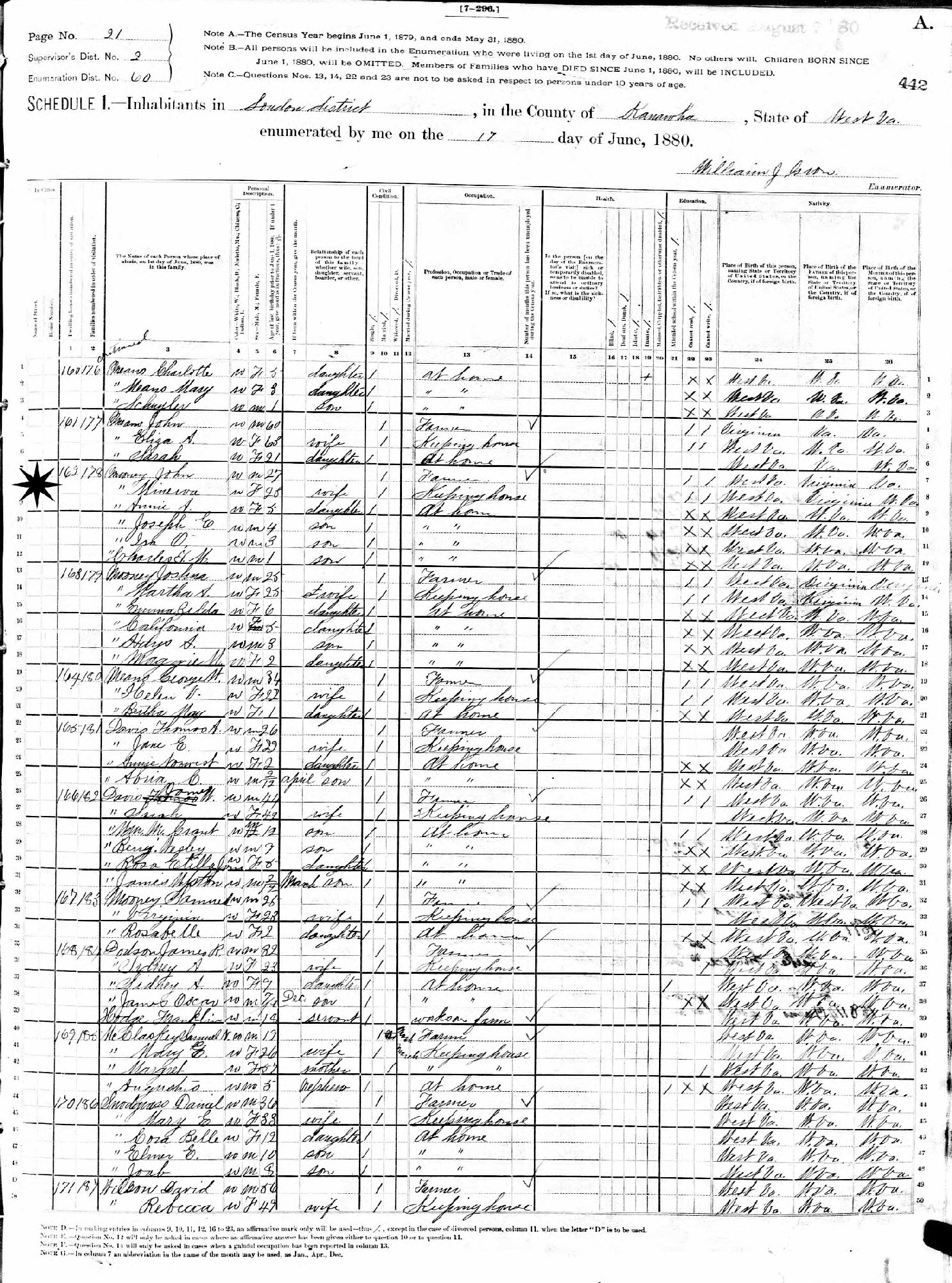 June 17, 1880 - Supervisor's District 2, Enumeration District 60, Loudon District, Kanawha County, West Virginia.