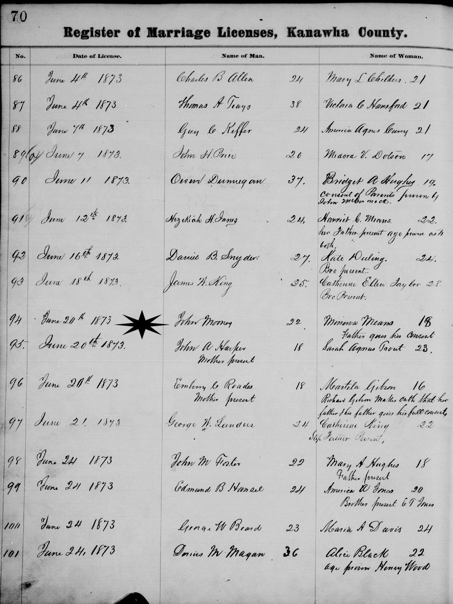 Married: Minerva Means June 20, 1873 in Kananwha County, West Virginia.