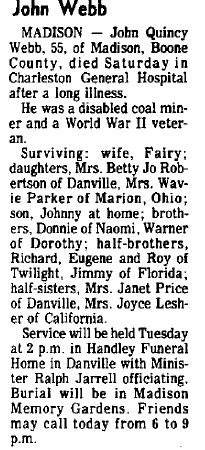 Died: June 8, 1974 in Madison, Boone County, West Virginia.