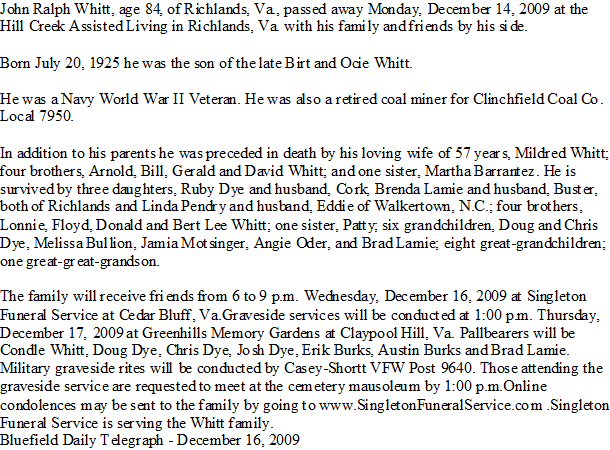 Died: December 14, 2009 in Richlands, Tazewell County, Virginia.
