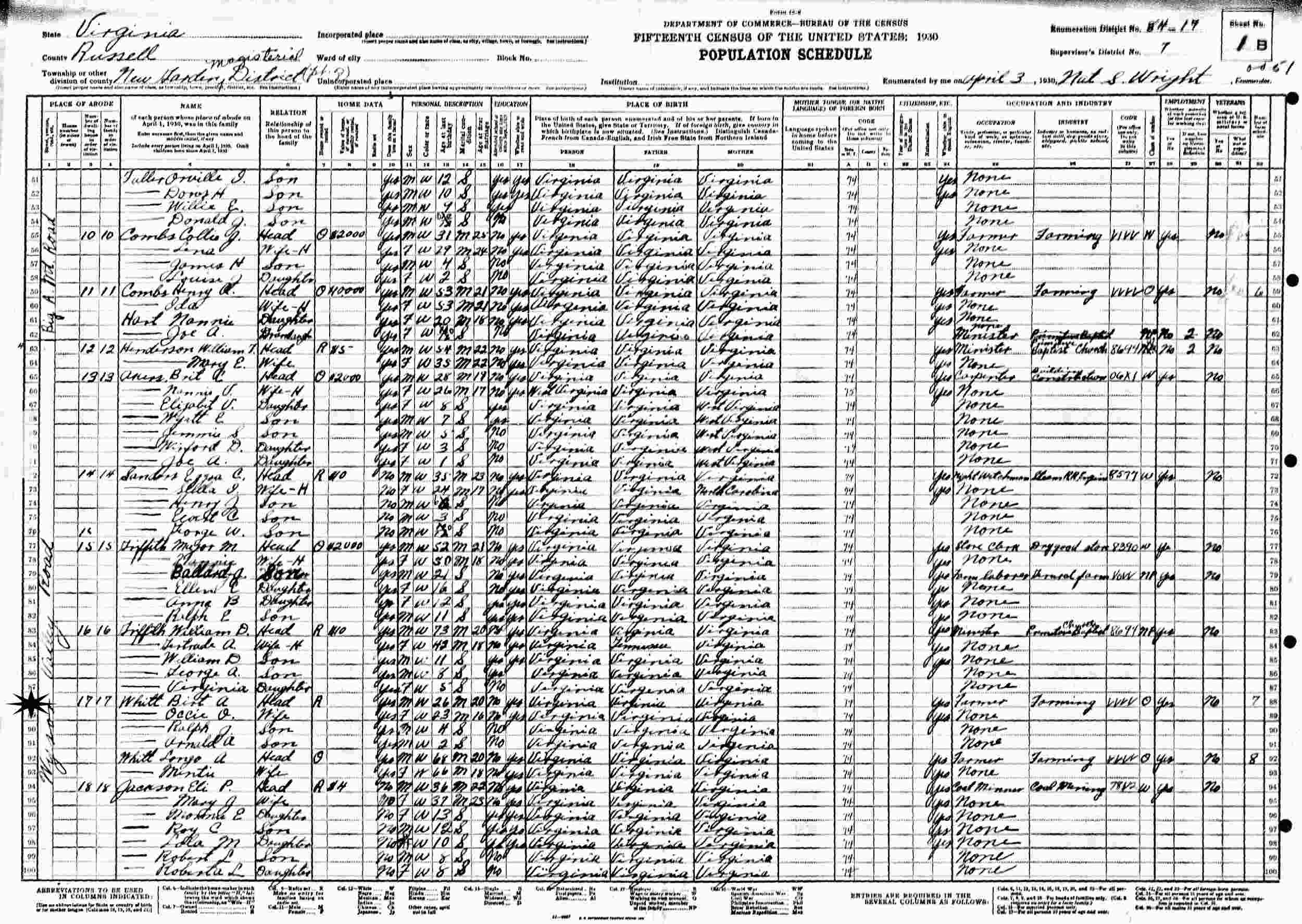 April 4, 1930 - Wyson Valley Road, Supervisor's District 7, Enumeration District 84-17, New Garden Magisterial District, Russell County, Virginia.