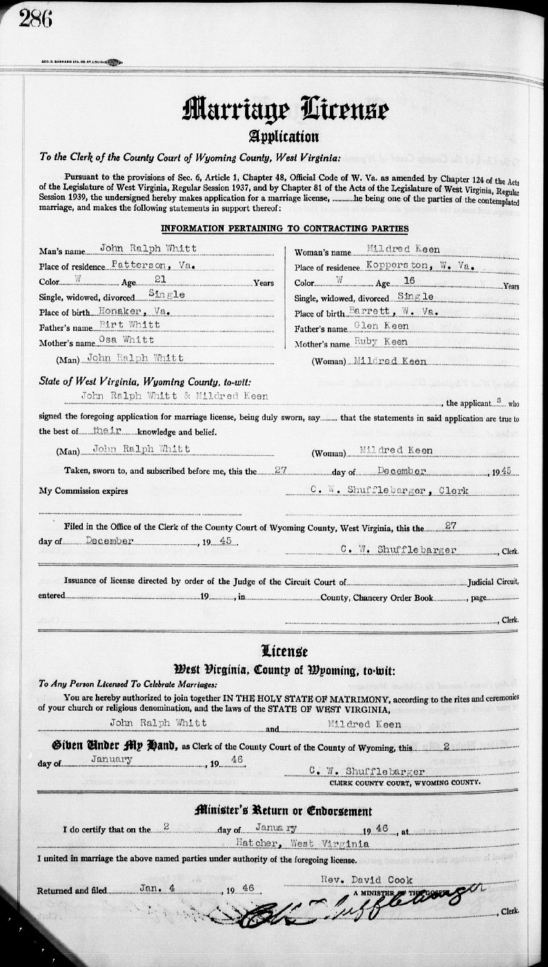 Married: Mildred Keen January 02, 1946 in Hatcher, Wyoming County, West Virginia. (Marriage License: December 27, 1945.)