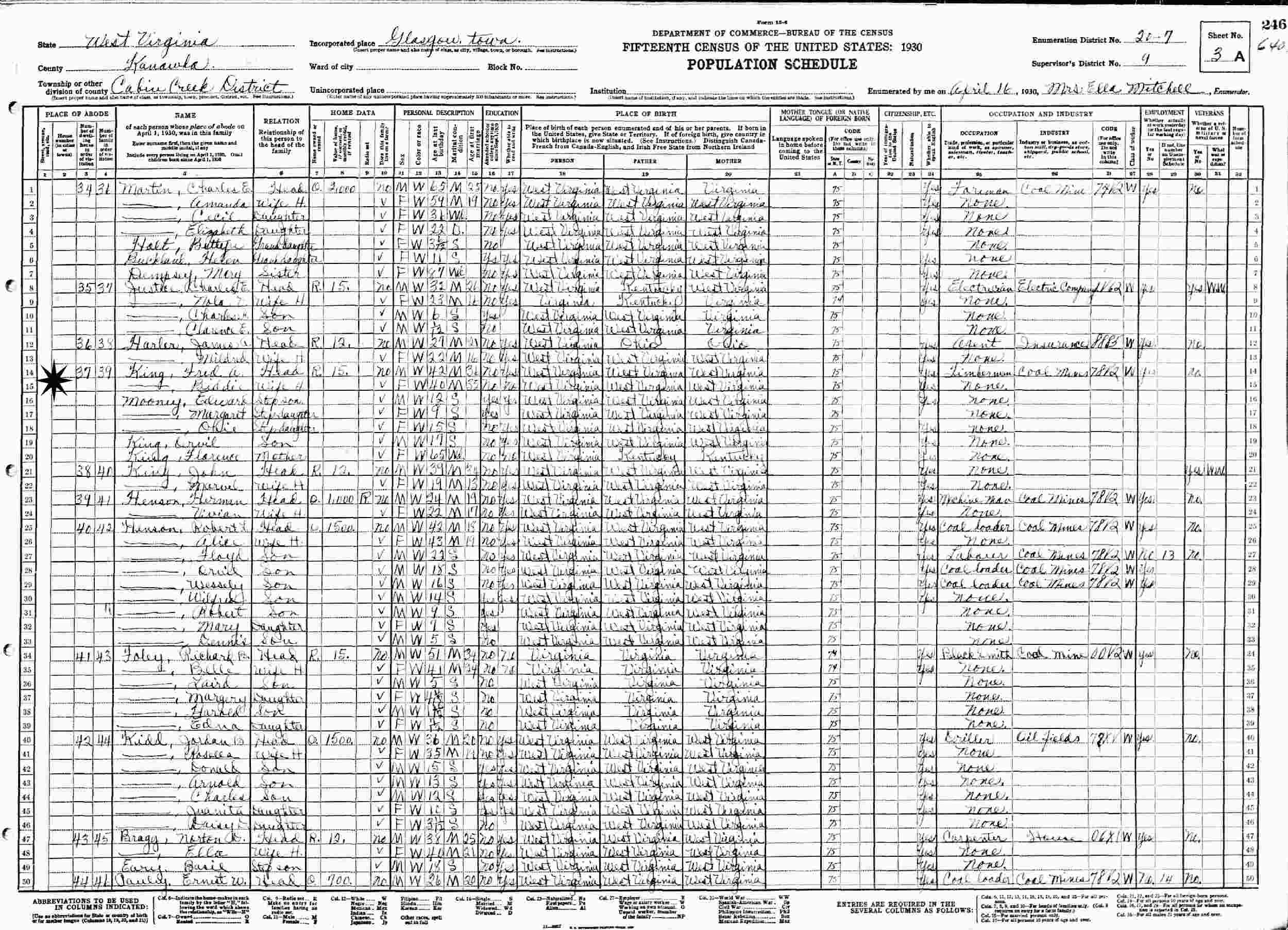 April 16, 1930 - Supervisor's District 9, Enumeration District 20-7, Cabin Creek District, Glasgow Town, Kanawha County, West Virginia.