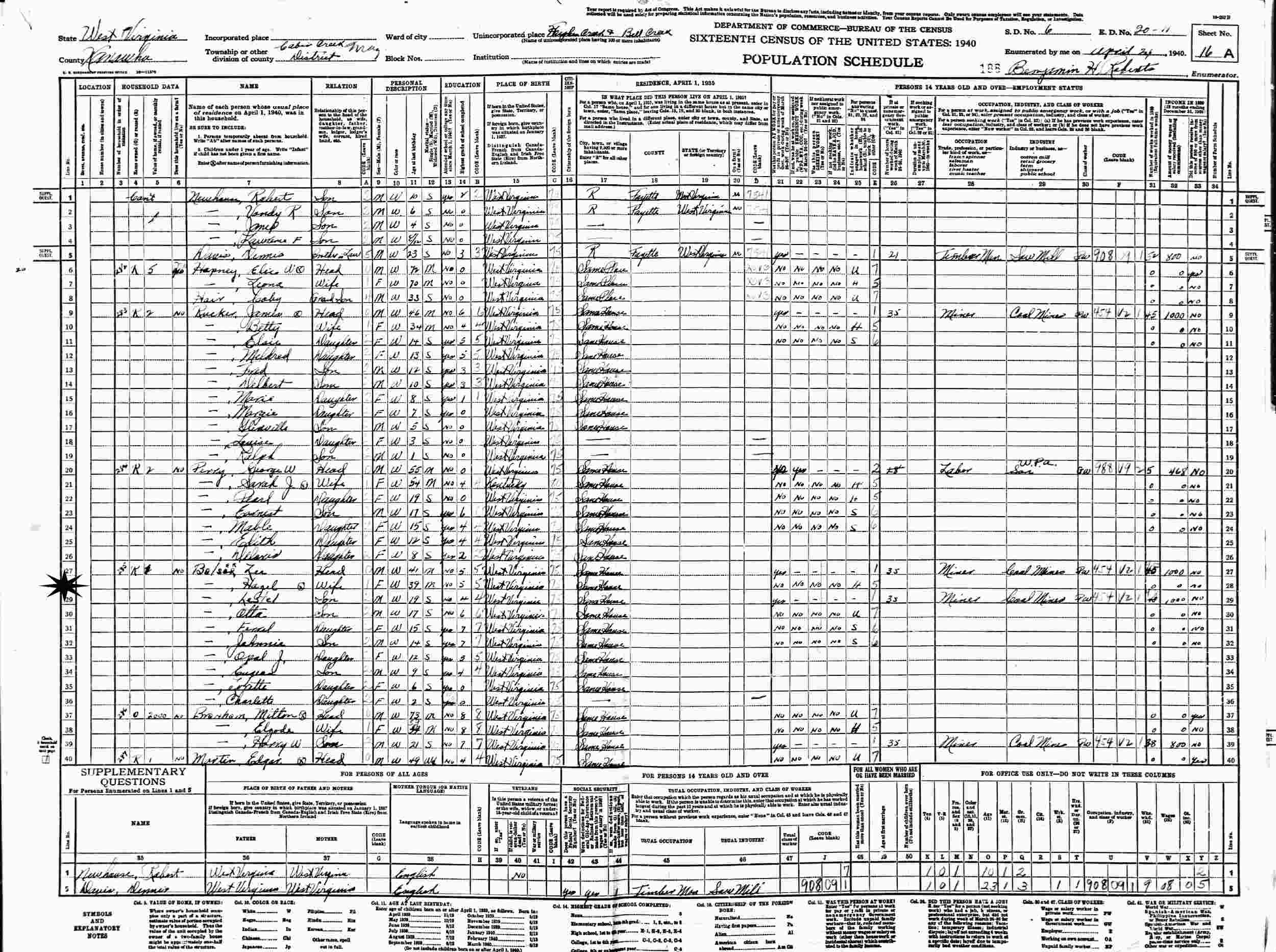 April 26, 1940 - Supervisor's District 6, Enumeration District 20-11, Cabin Creek Magisterial District, Hughes Creek and Bell Creek, Kanawha County, West Virginia.