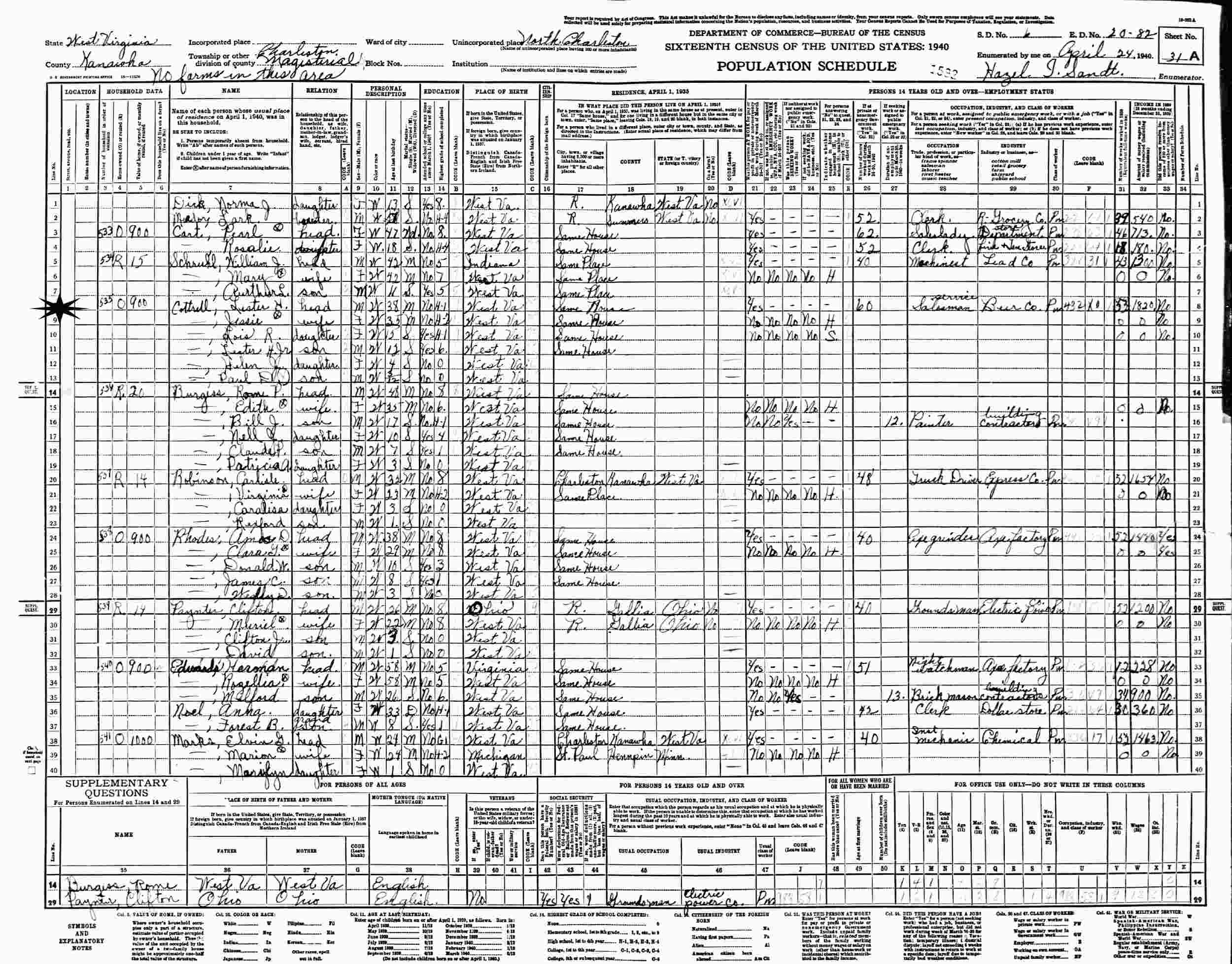 April 24, 1940 - Supervisor's District 6, Enumeration District 20-82, North Charleston, Kanawha County, West Virginia.