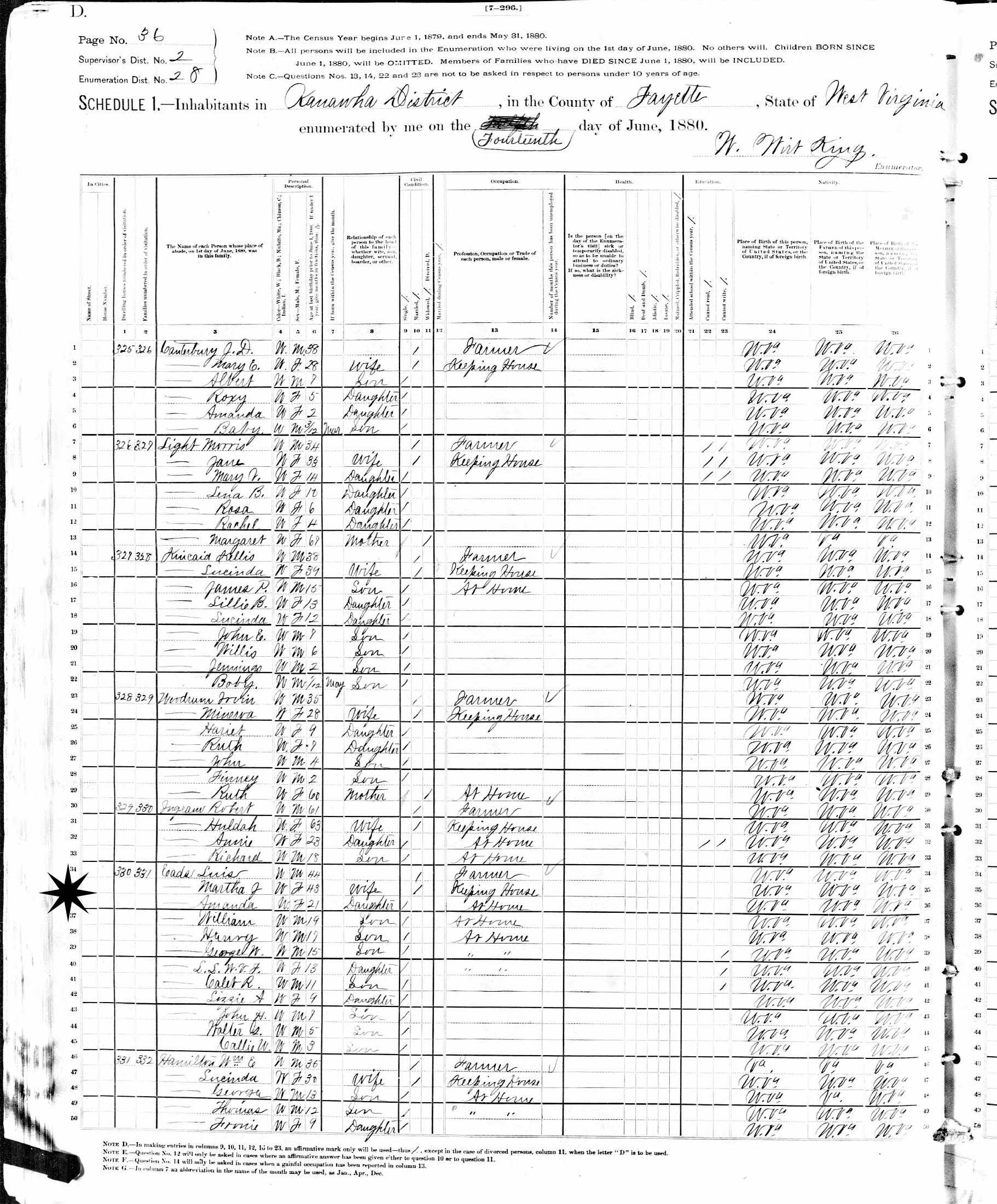June 14, 1880 - Supervisor's District 2, Enumeration District 28, Kanawha District, Fayette County, West Virginia.