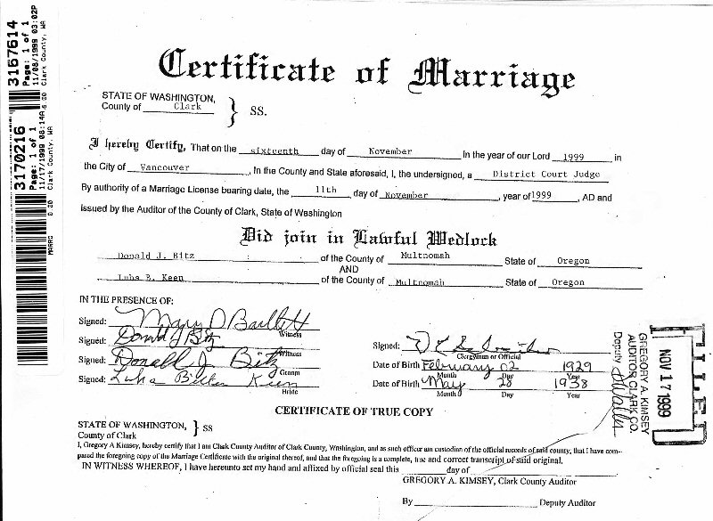 (8) Donald Jerome Bitz November 11, 1999 in Portland, Multnomah County, Oregon. (Marriage License: November 11, 1999.) (Marriage Verified with Marriage Certificate.)