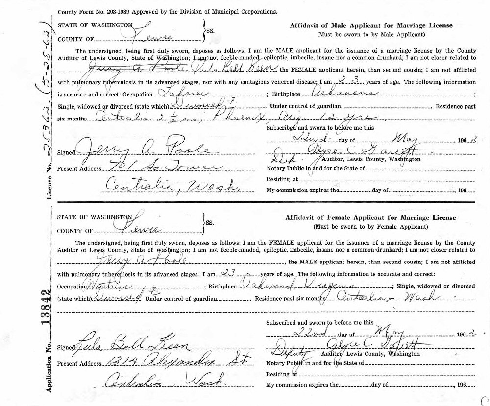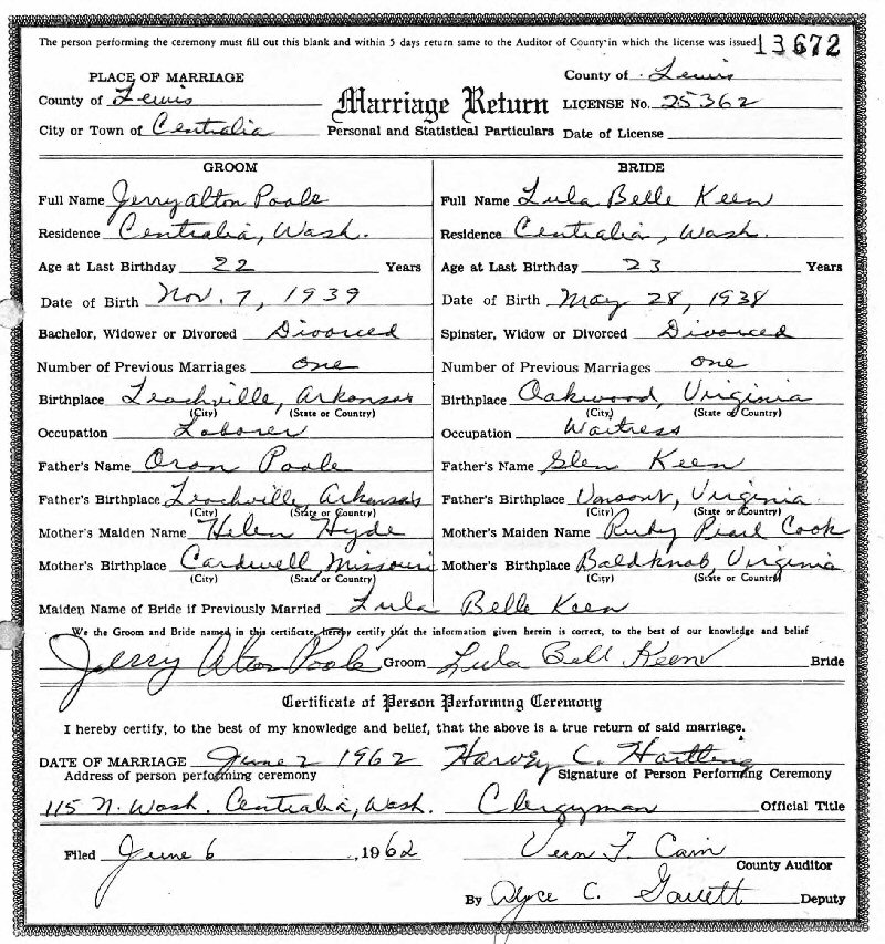 (2) Jerry Alton Poale June 2, 1962 in Lewis County, Washington. (Marriage verified w/Certificate.)