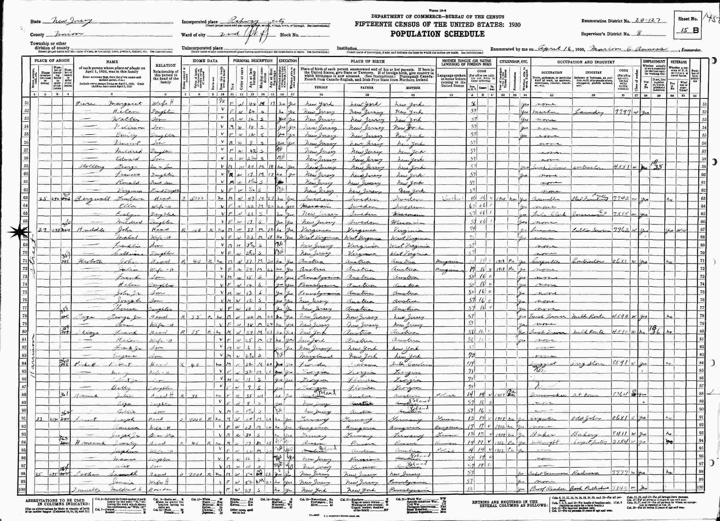 April 16, 1930 - 29 Harrison Street, Ward 2, Supervisor's District 8, Enumeration District 20-127, Rahway, Union County, New Jersey.