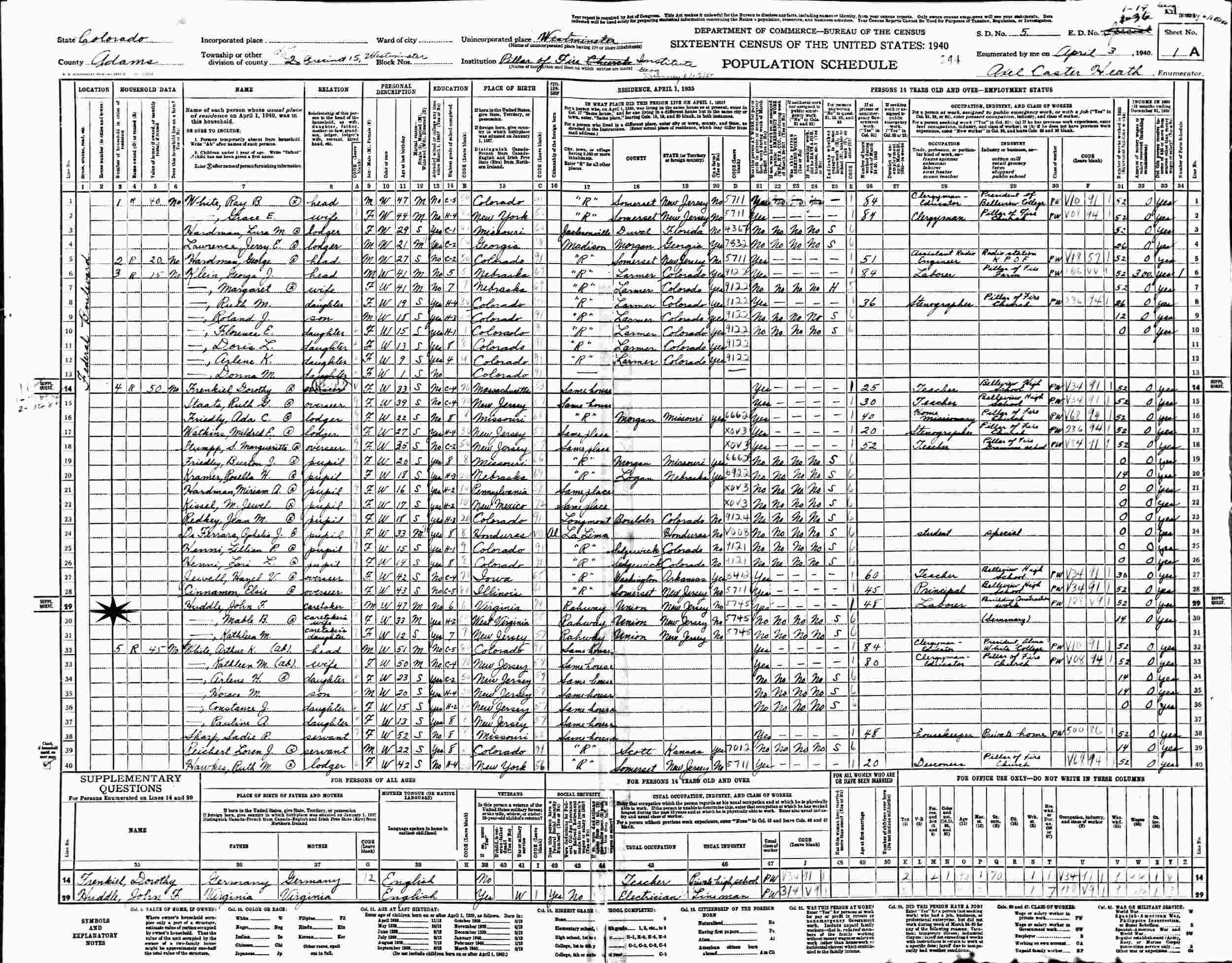 April 3, 1940 - PIllar of Fire Institute, Federal Boulevard, Precinct 15, Supervisor's District 5, Enumeration District 1-26 (crossed out to 1-19) Westminster, Adams County, Colorado.