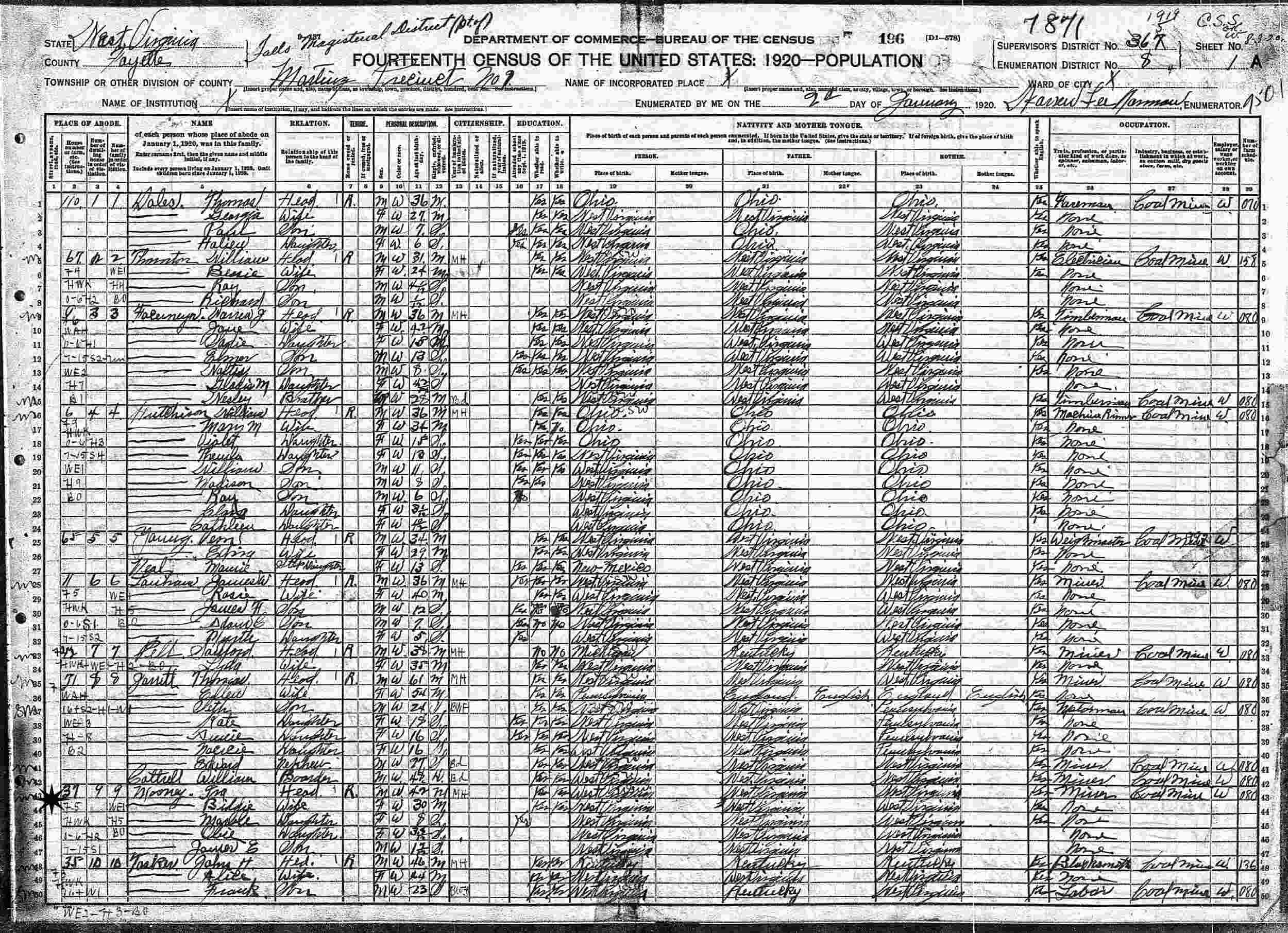 January 2, 1920 - Supervisor's District 367 (crossed out to 5), Enumeration District 8, Martinez Precinct, Falls Magisterial District, Fayette County, West Virginia.