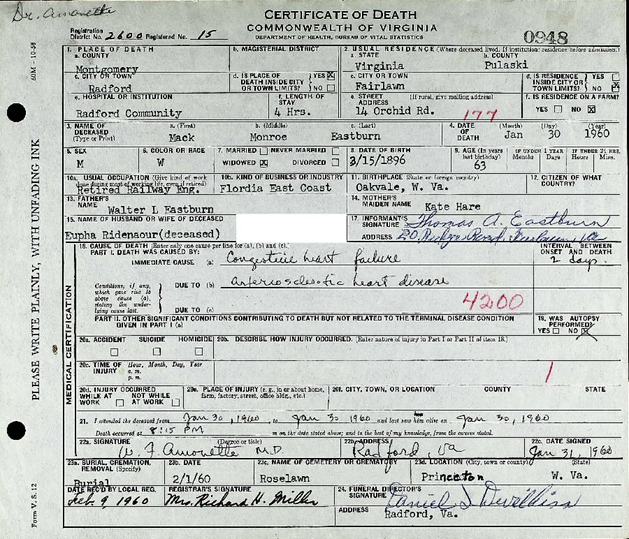 Died: Oakvale, Harrison County, West Virginia in Radford Community Hospital, Radford, Virginia.