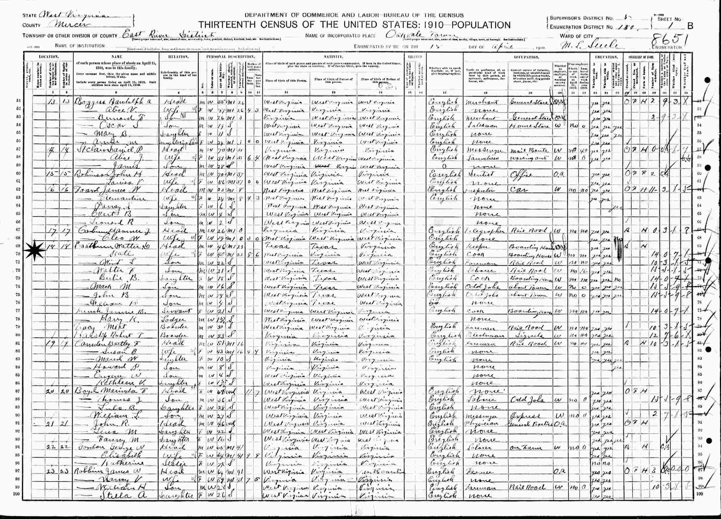 April 18, 1910 - Supervisor's District 5, Enumeration District 130?, East River District, Oakvale Town, Mercer County, West Virginia.