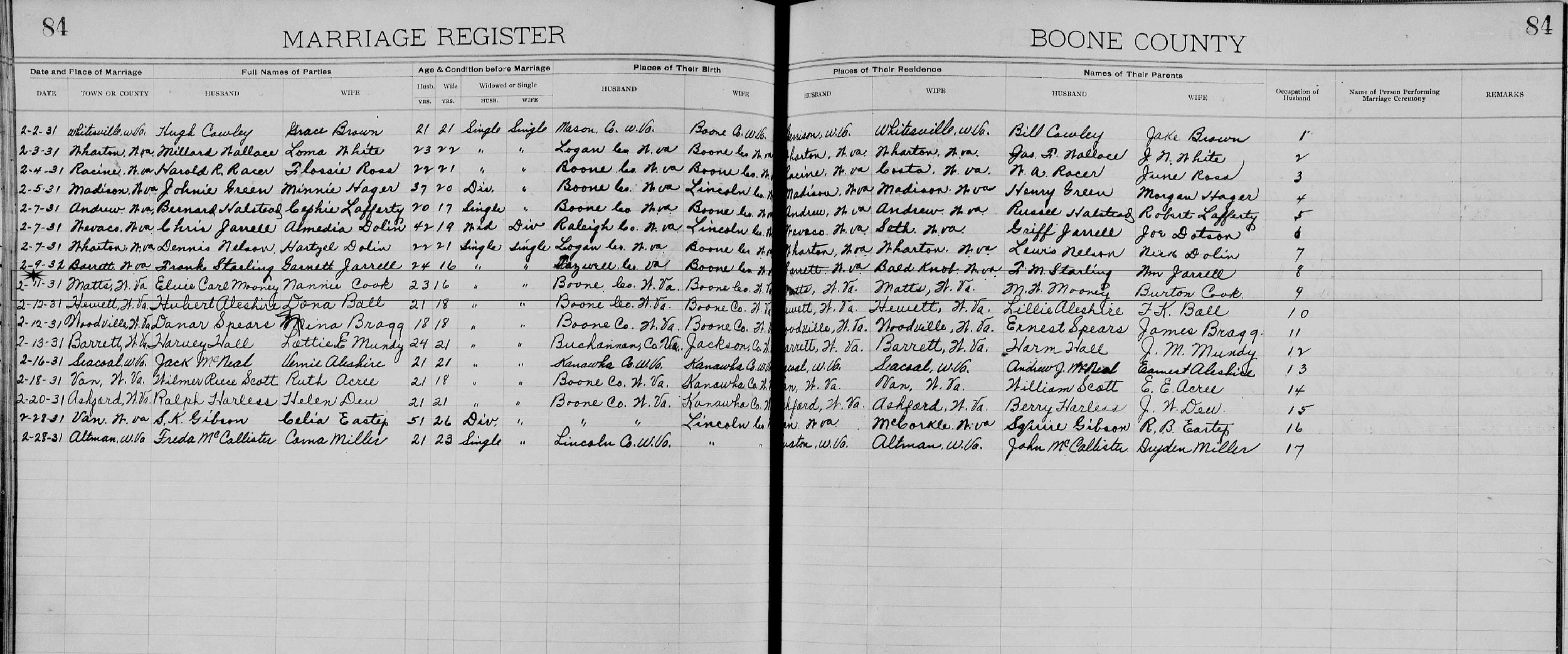 Married: Carl Elvie Mooney February 11, 1931 in Matts, Boone County, West Virginia.