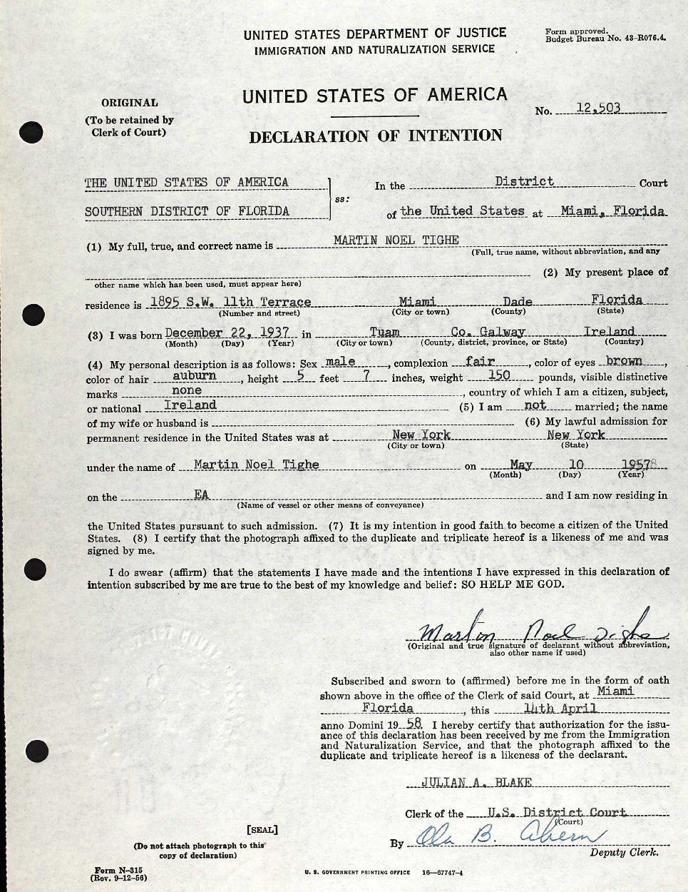 Declaration of Intention: April 14, 1958 in Miami, Miami-Dade County, Florida.