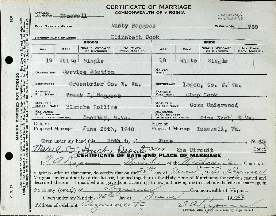 Married: Ausby Lorenzo Boggess June 25, 1940 in Tazewell County, Virginia.
