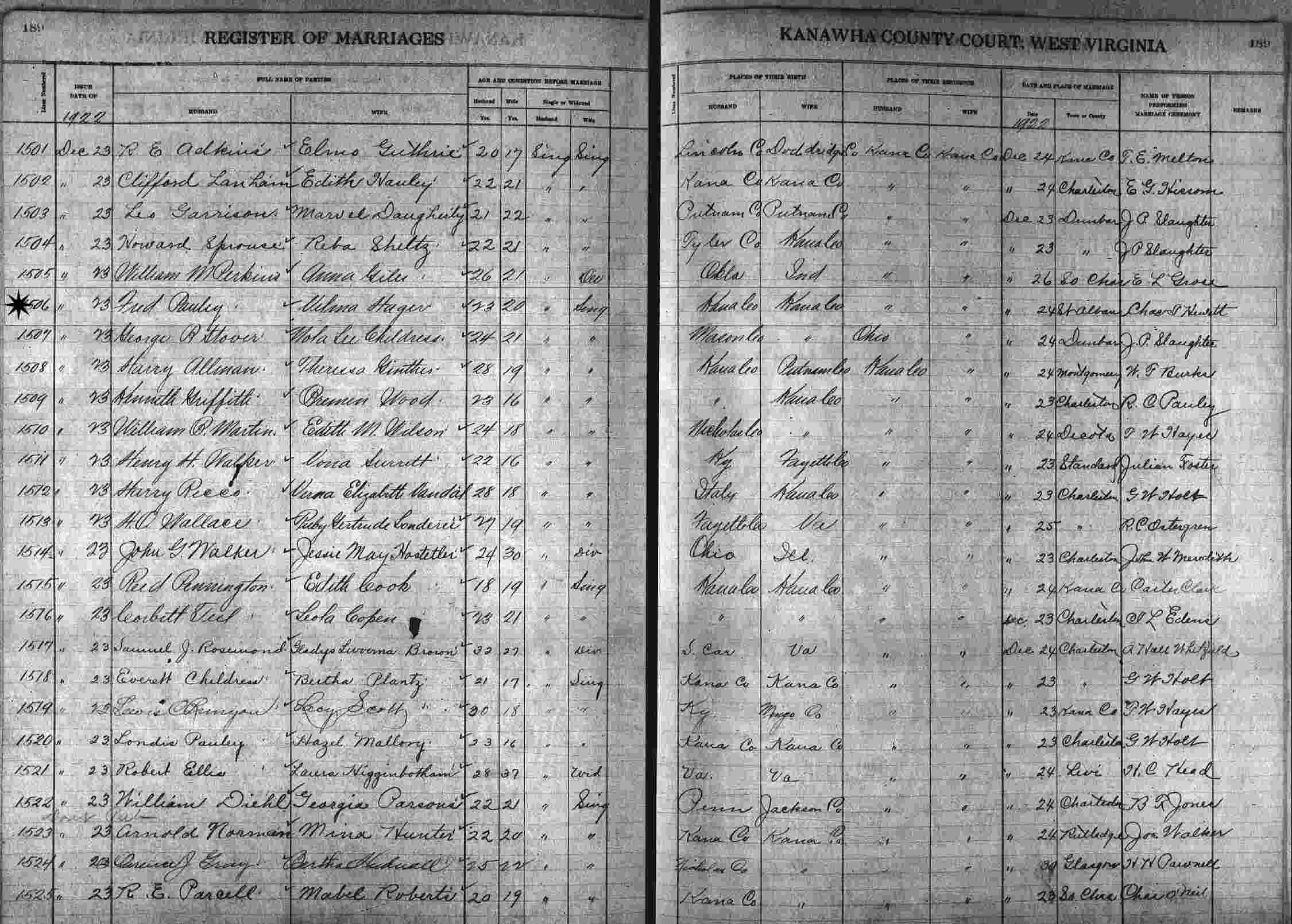 Married: Fred Pauley December 24, 1922 in St. Albans, Kanawha County, West Virginia. (Marriage License: December 23, 1922.)