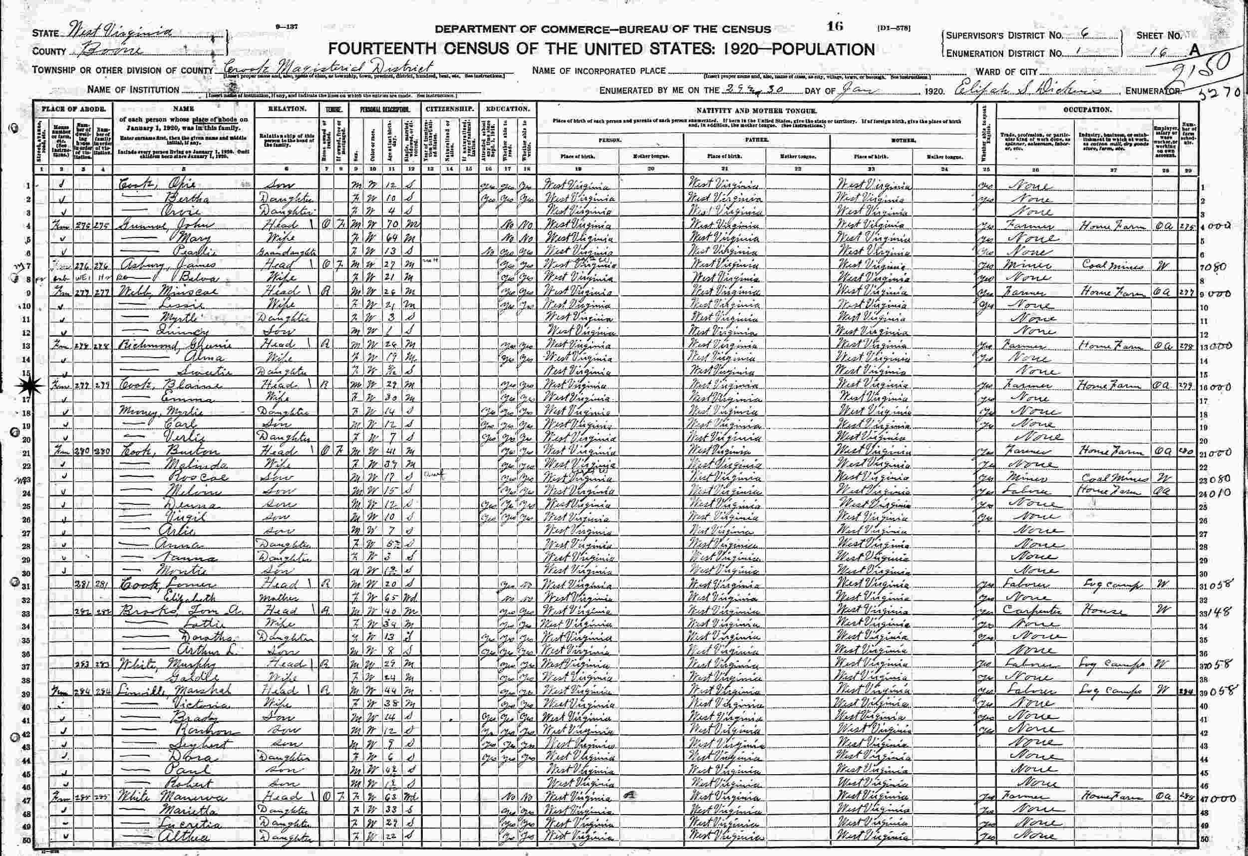 January 29-30, 1920 - Supervisor's District 6, Enumeration District 1, Crook Magisterial District, Boone County, West Virginia.