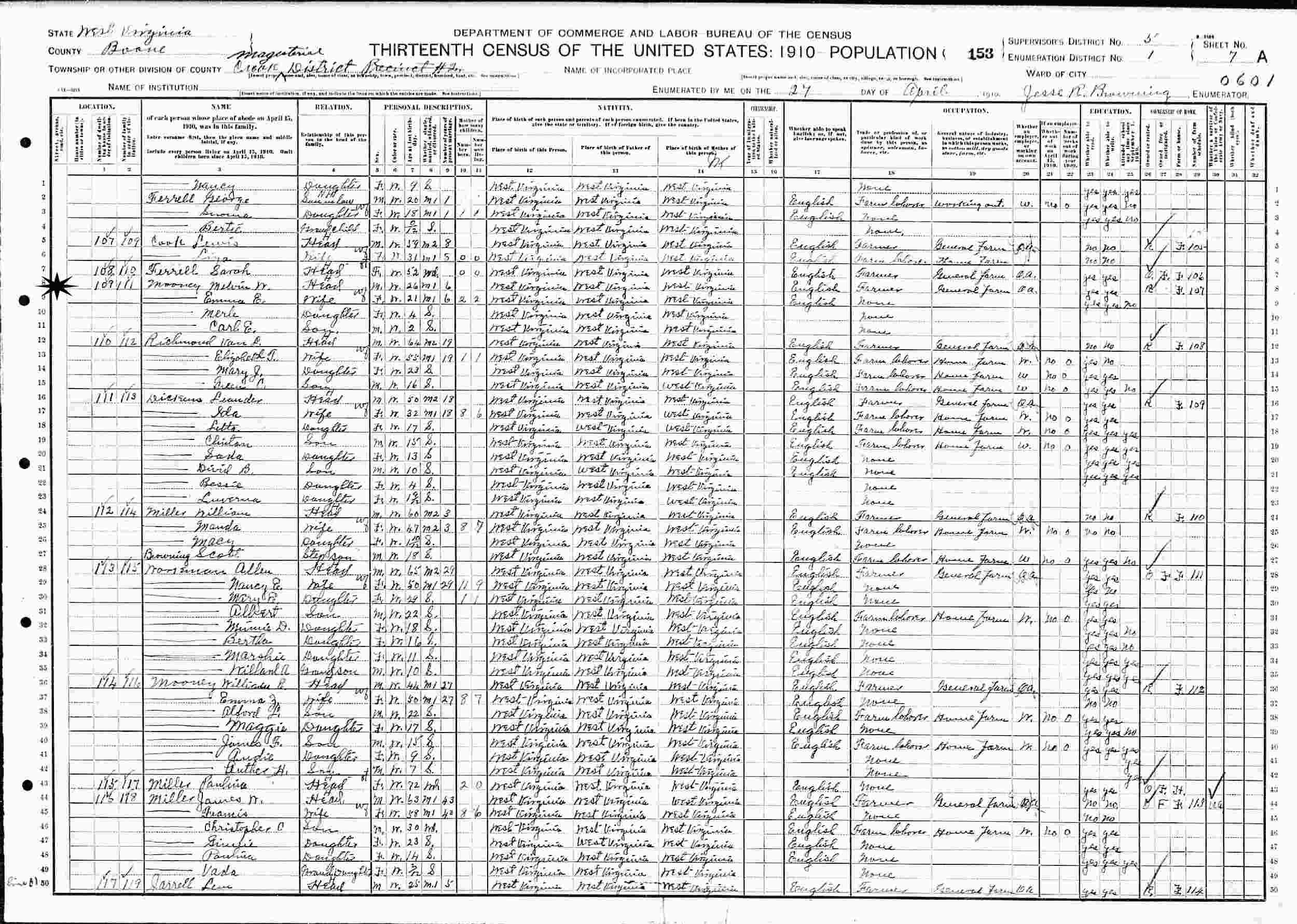April 27, 1910 - Supervisor's District 5, Enumeration District 1, Crook Magisterial District, Boone County, West Virginia.