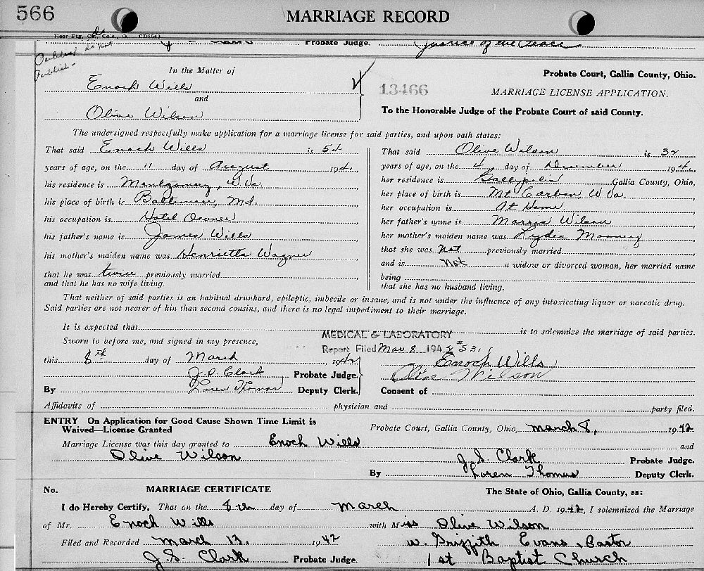 Married Enoch Wills March 8, 1942 in Gallia County, Ohio.