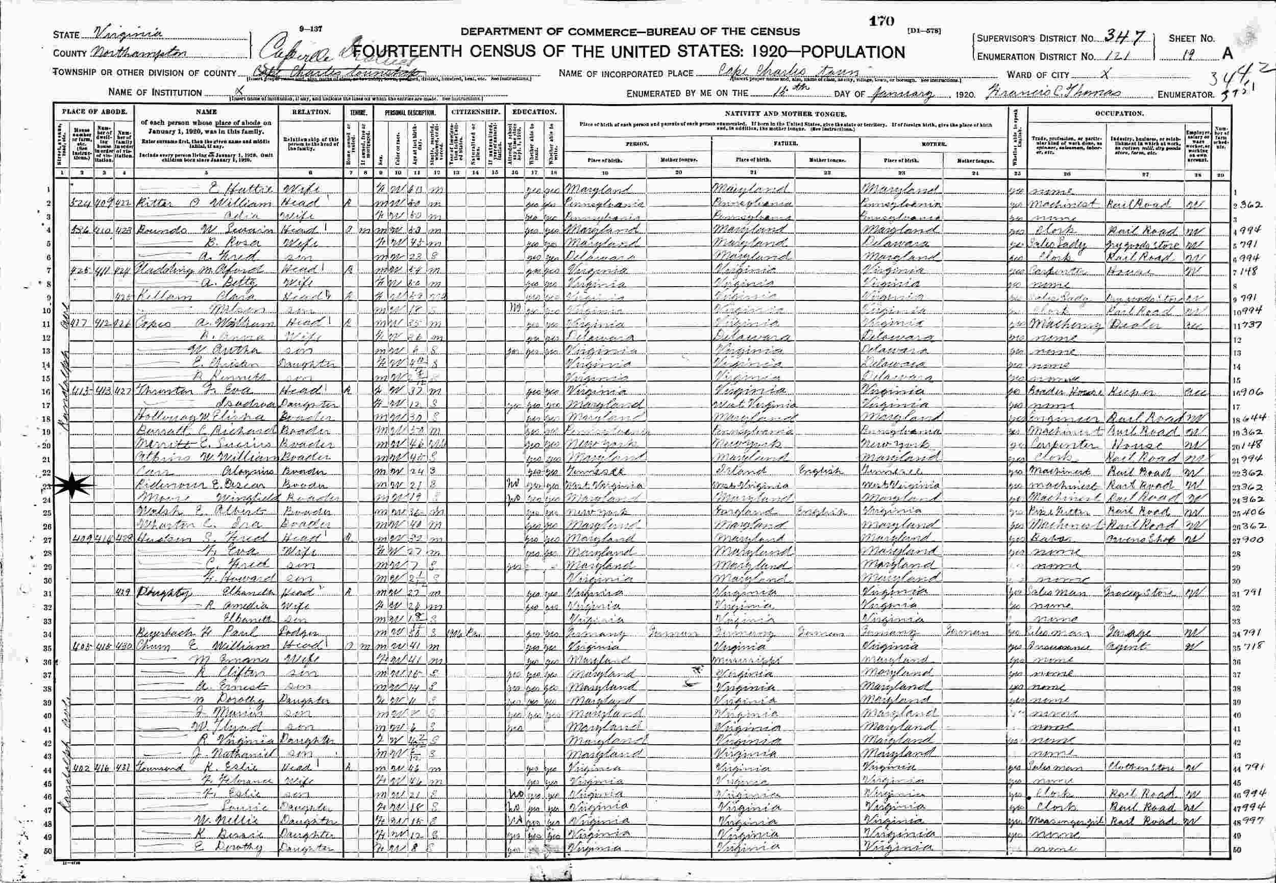 January 16, 1920 - 413 Randolph Avenue, Supervisor's District 347, Enumeration District 121, Capville District, Cape Charles Town, Northampton County, Virginia (Boarder).