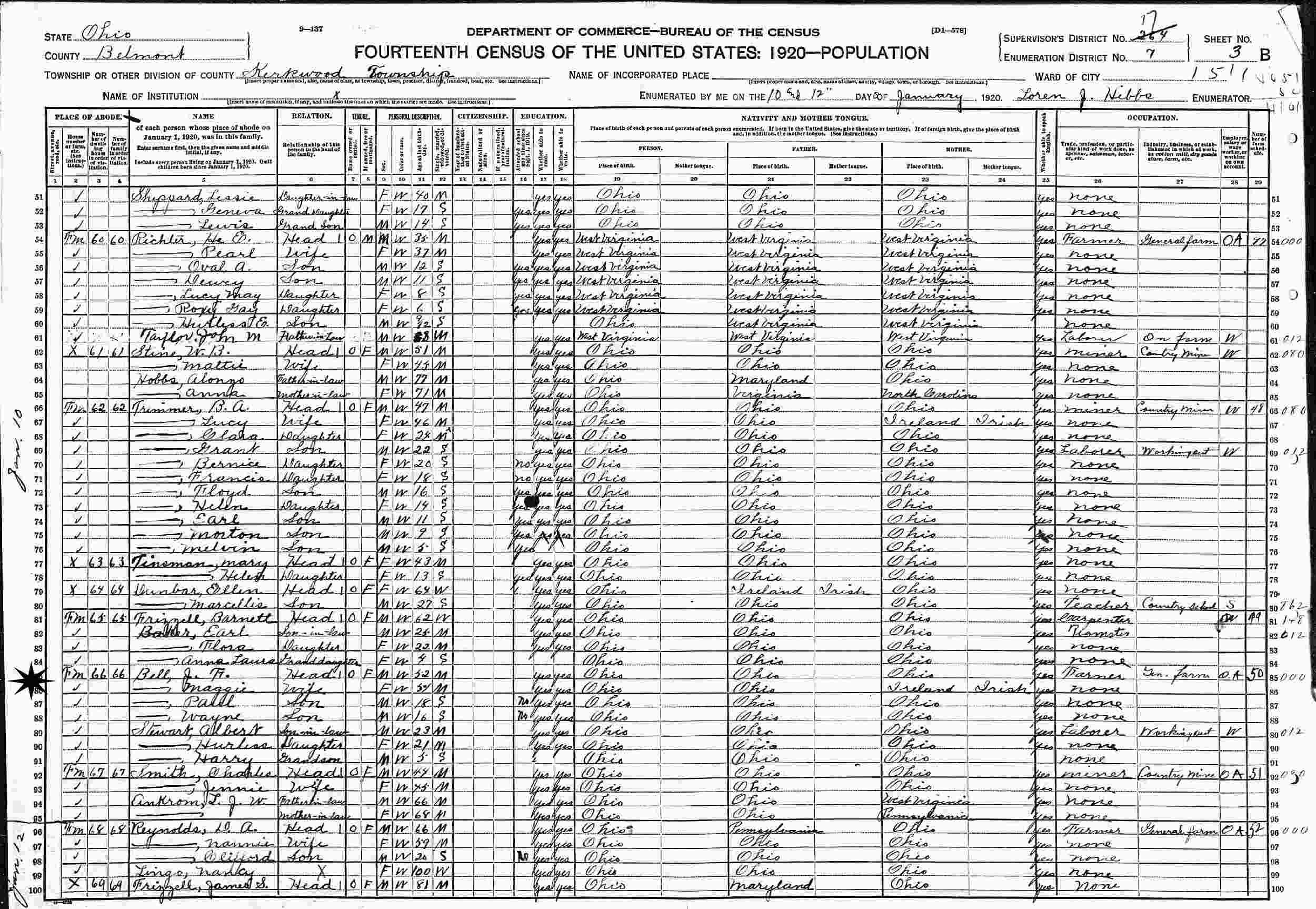 January 10-12, 1920 - Supervisor's District 264 (crossed out to 17), Enumeration District 7, Kirkwood Township, Belmont County, Ohio.