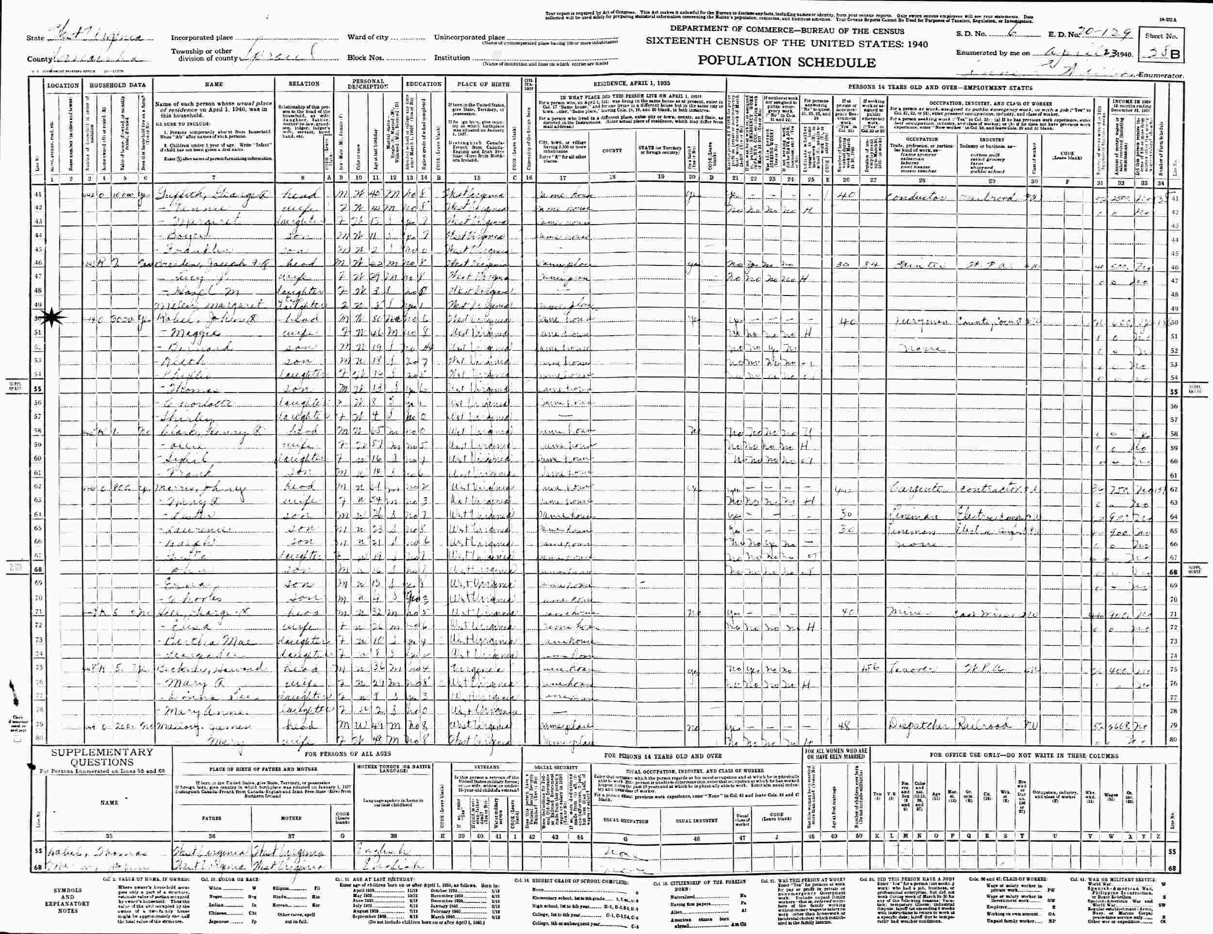 April 23, 1940 - Supervisor's District 6,, Enumeration District 20-129, Spraud, Kanawha County, West Virginia.