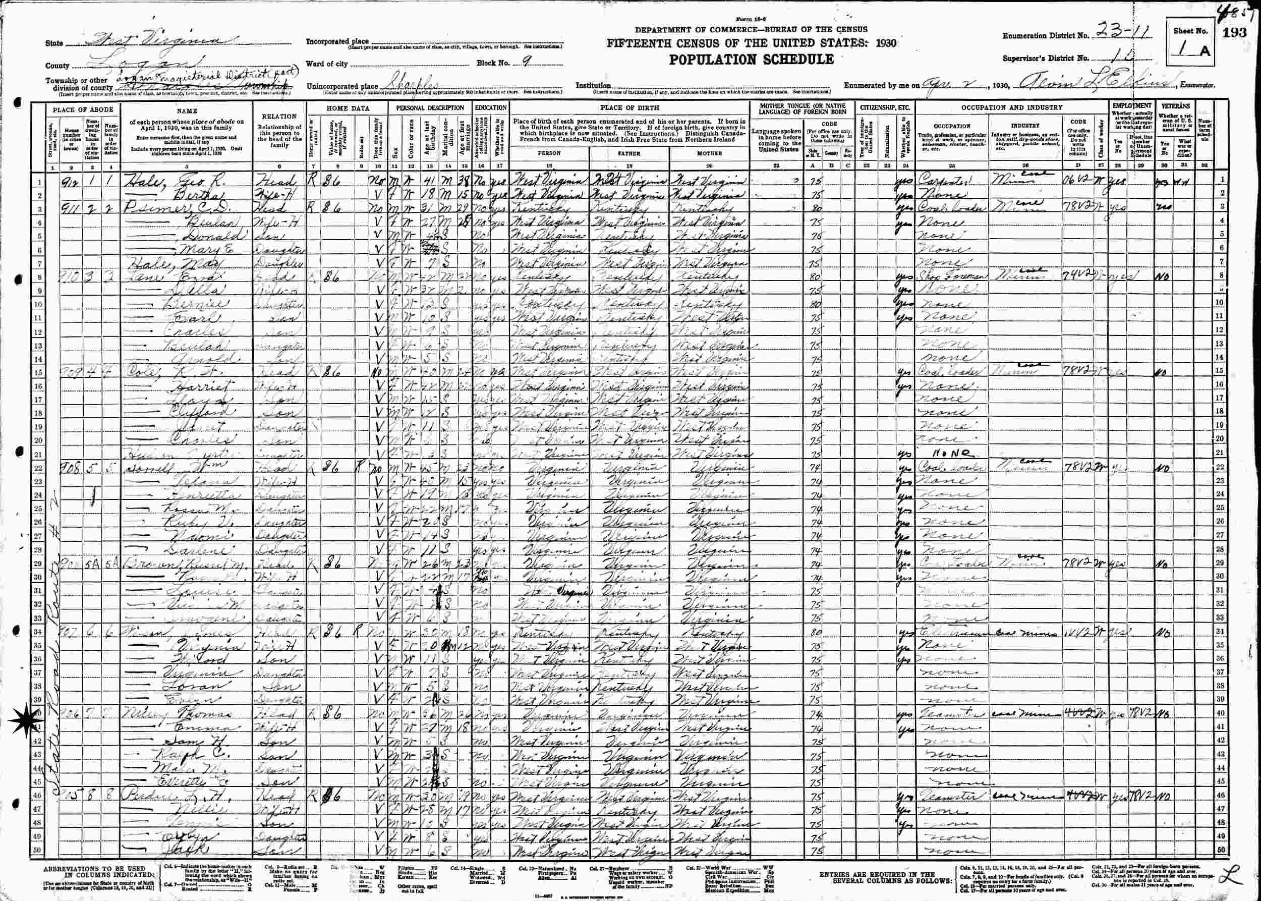 April 2, 1930 - 906 State Road Route #2, Block 9, Supervisor's District 10, Enumeration District 23-11, Logan Magisterial District, Logan County, West Virginia.