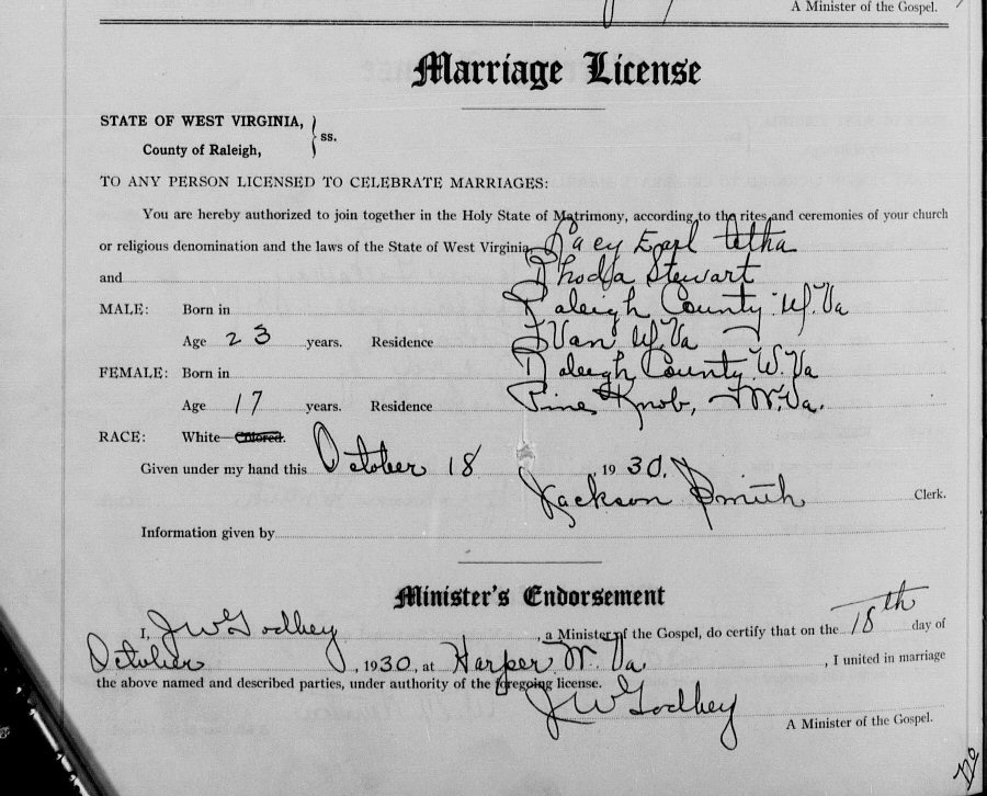 Married: Lacy Earl Atha October 18, 1930 in Harper, Raleigh County, West Virginia.