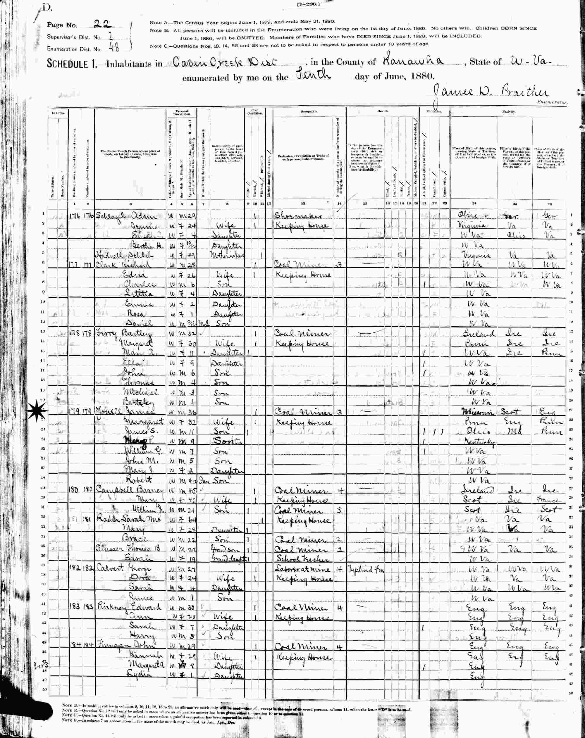 June 10, 1880 - Supervisor's District 2, Enumeration District 48, Cabin Creek District Kanawha County, West Virginia.