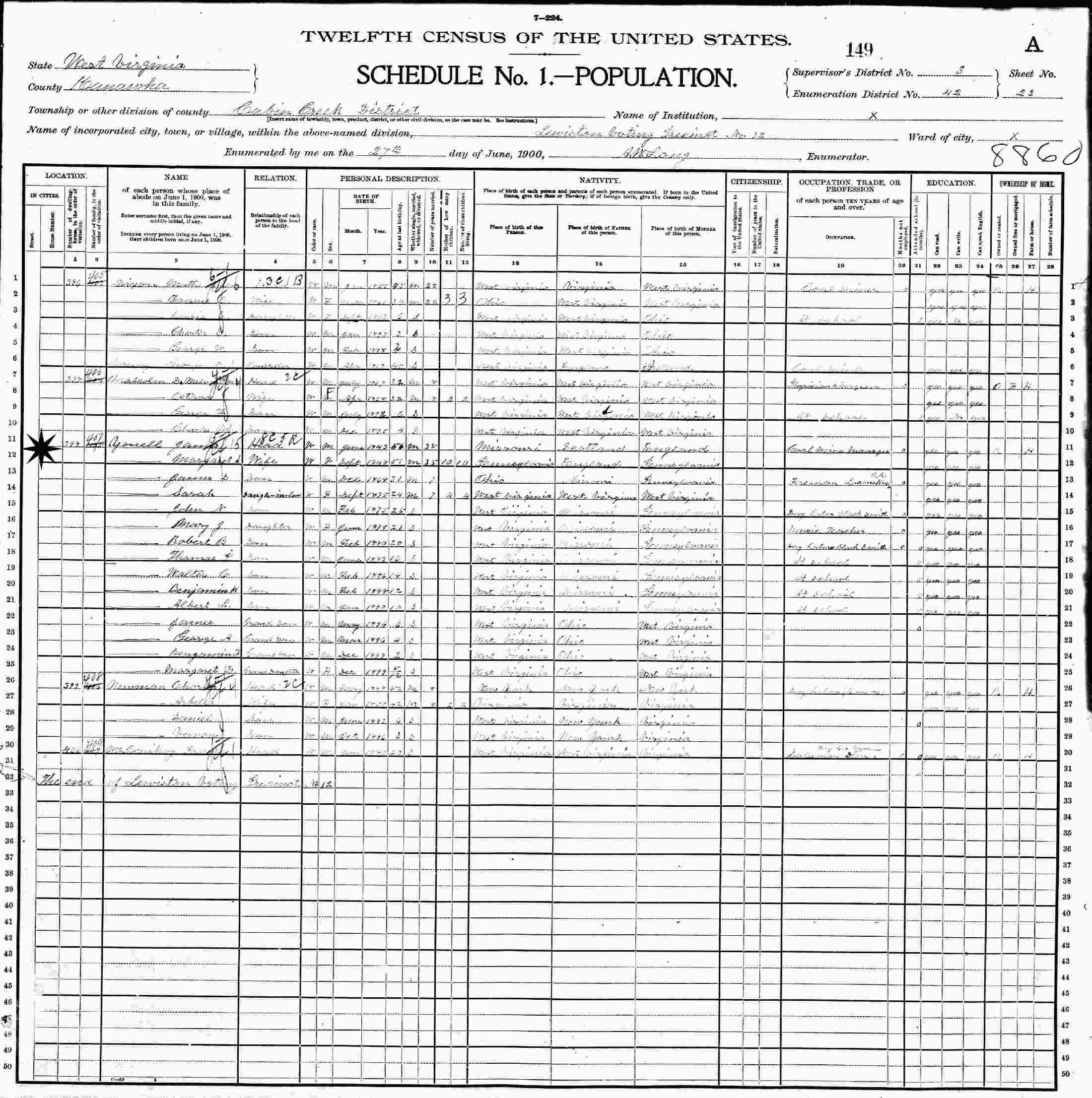 June 27, 1900 - Supervisor's District 3, Enumeration District 42, Cabin Creek District, Lewiston Voting Precinct No. 12, Kanawha County, West Virginia.