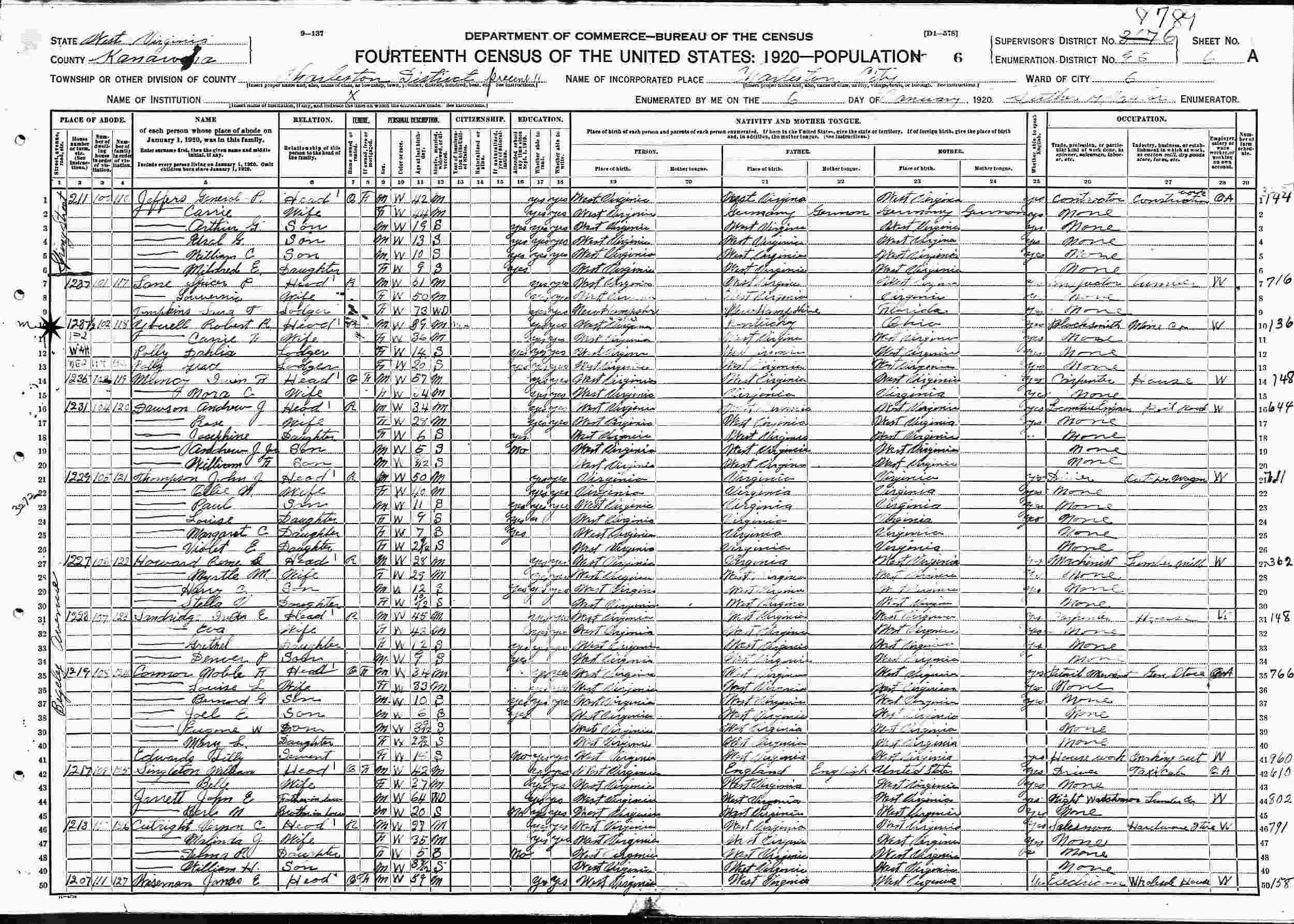 January 6, 1920 - 1287 1/2 Bigeley Avenue, Precinct 11, Ward 6, Supervisor's District 367 (crossed out to 6), Enumeration District 96, Charleston, Kanawha County, West Virginia.