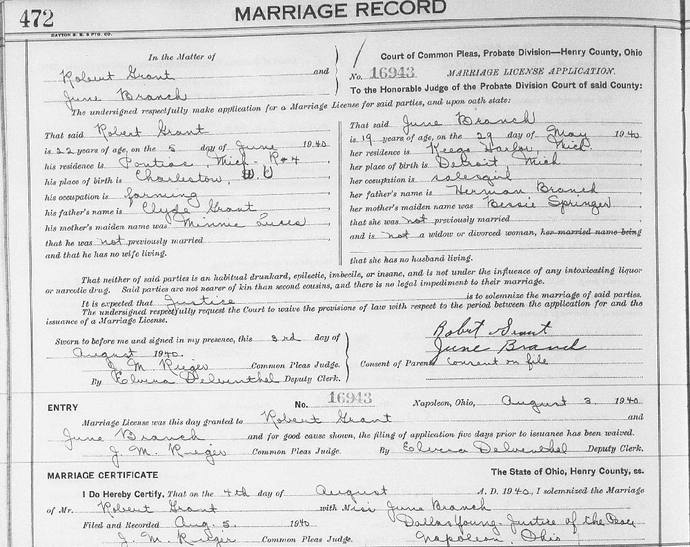 Married: June Bessie Branch August 4, 1940 in Henry County, Ohio.