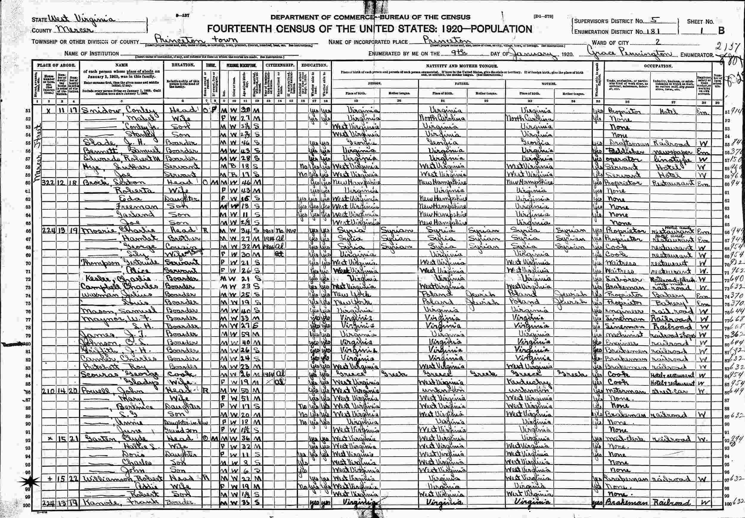January 9, 1920 - 210 Mercer Street, Ward 2, Supervisor's District 5, Enumeration District 181, Princeton, Mercer County, West Virginia.