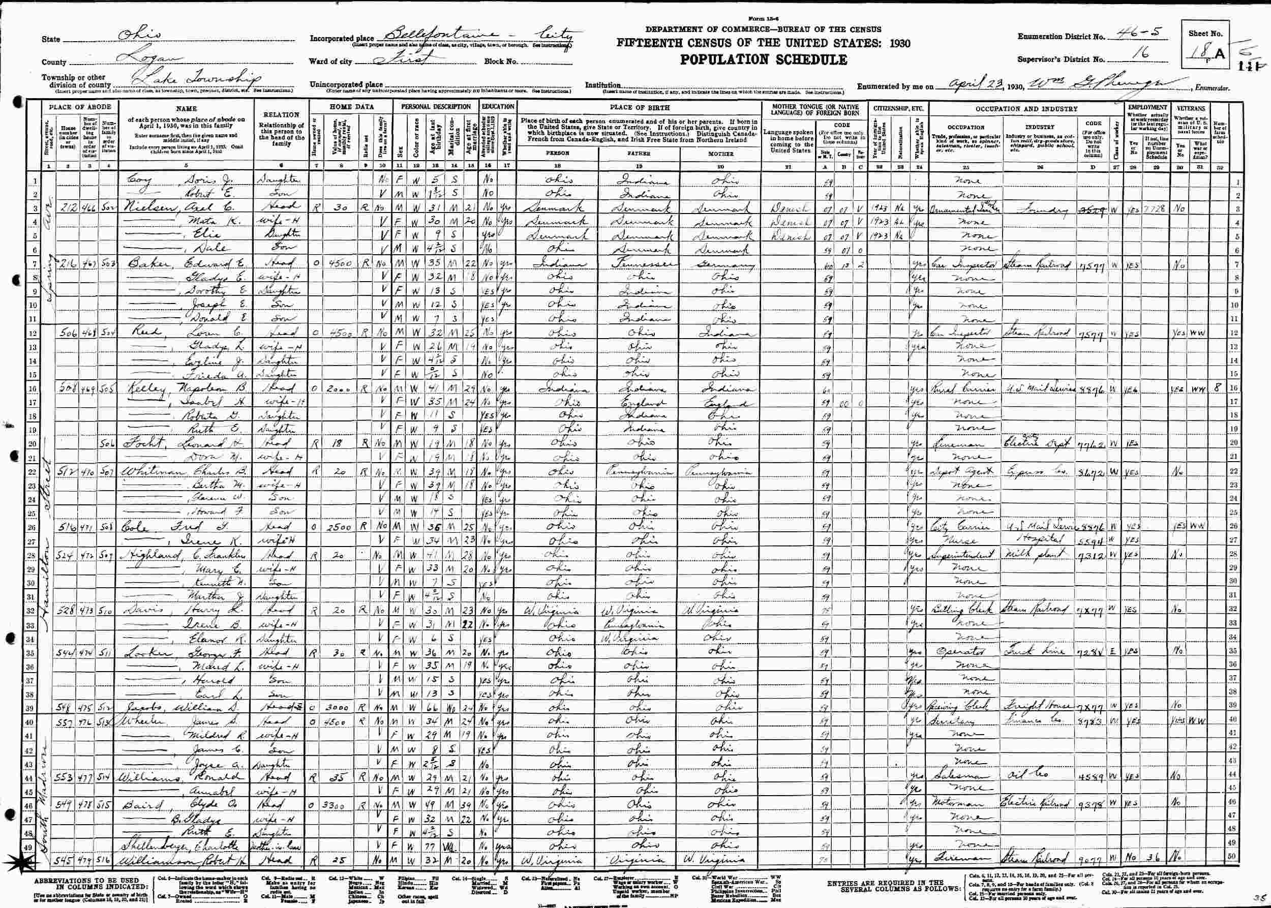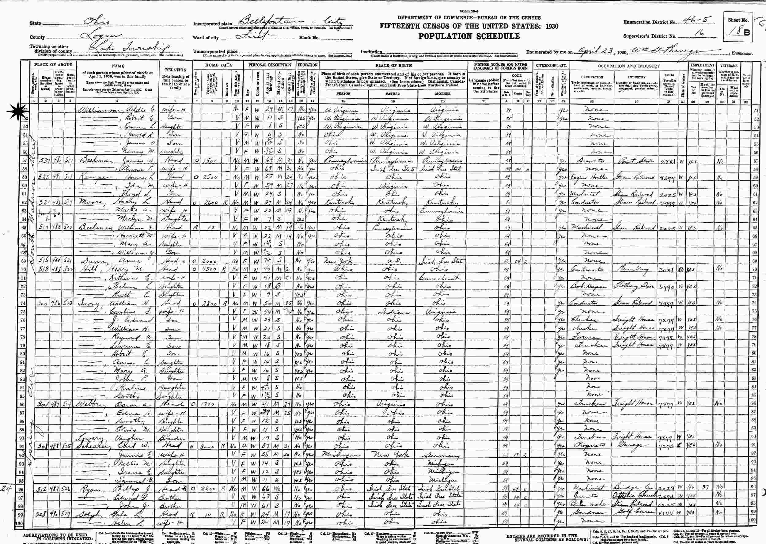 April 23, 1930 - 545 South Madison Street, First Ward, Supervisor's District 16, Enumeration District 46-5, Lake Township, Bellefontaine City, Logan County, Ohio.