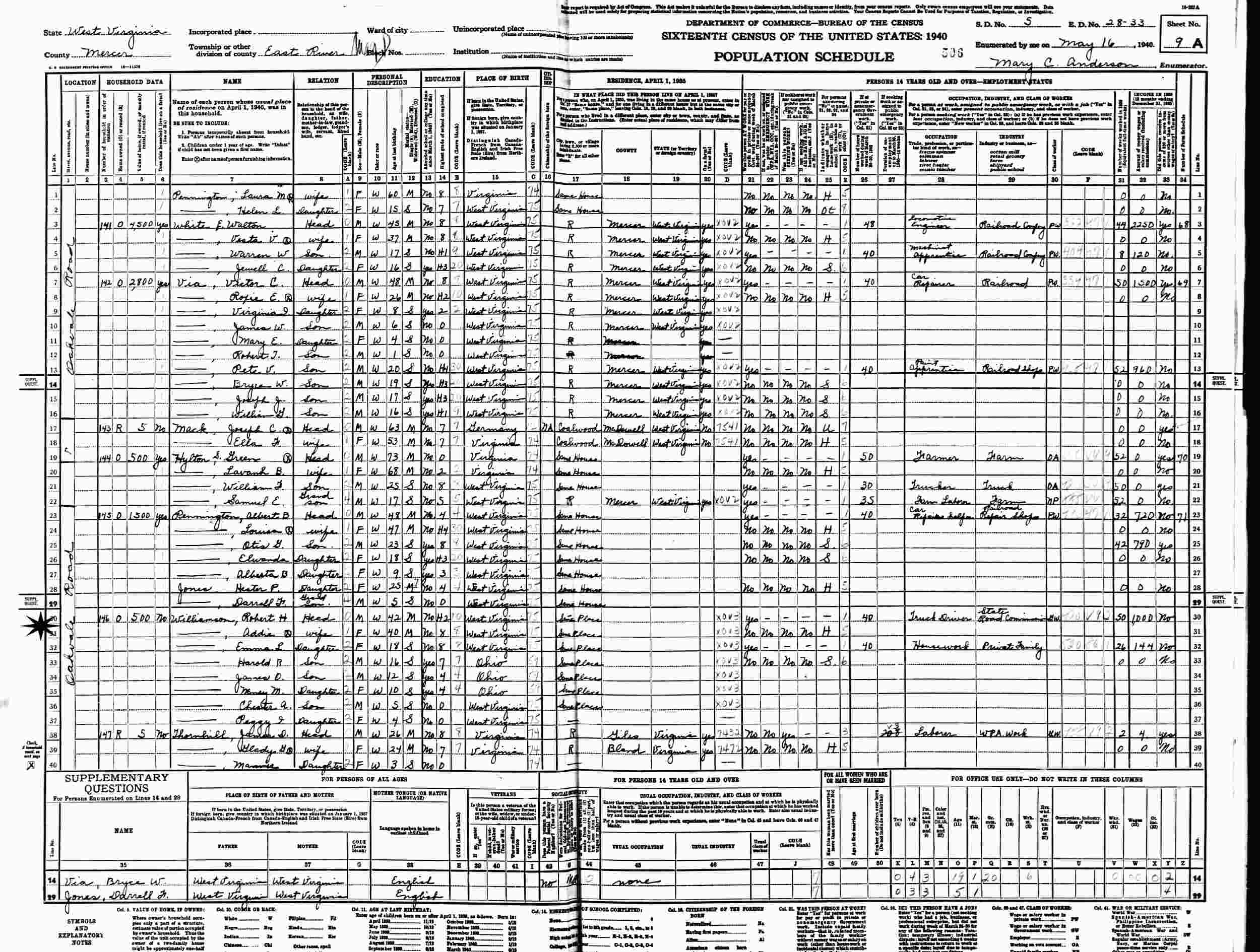 May 16, 1940 - Oakvale Road, Supervisor's District 5, Enumeration District 28-33, East River Magisterial District, Mercer County, West Virginia.