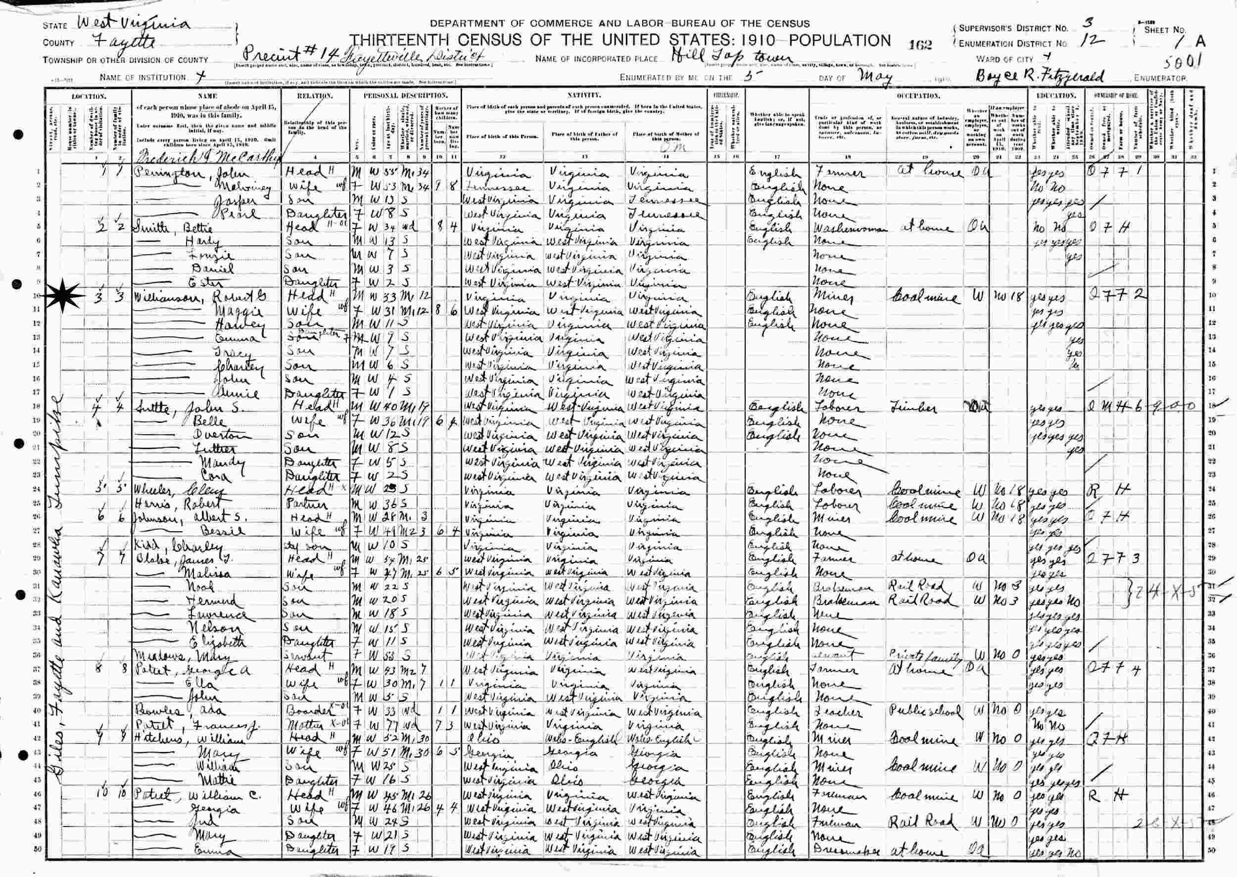 May 5, 1910 - Giles, Fayette and Kanawha Turnpike, Precinct 14, Supervisor's District 3, Enumeration District 12, Fayetteville District, Hill Gap Town, Fayette County, West Virginia.