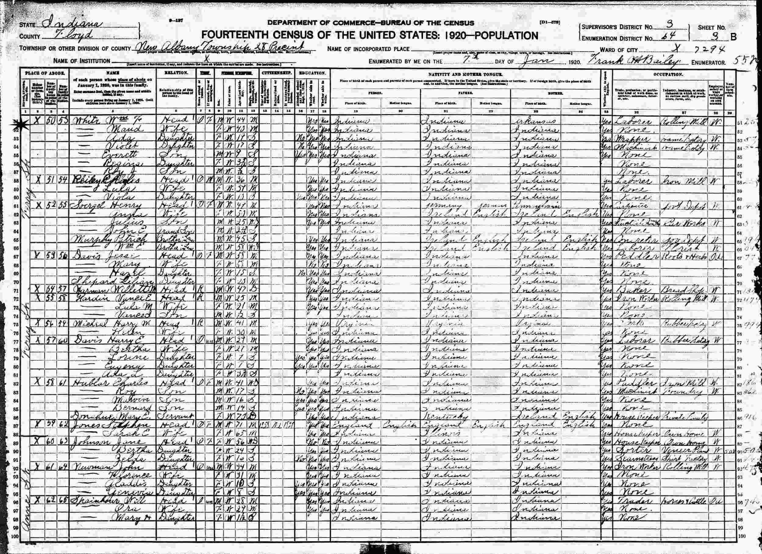 January 7, 1920 - Ferry Street, Precinct 28, Supervisor's District 3, Enumeration District 64, New Albany Township, Floyd County, Indiana.