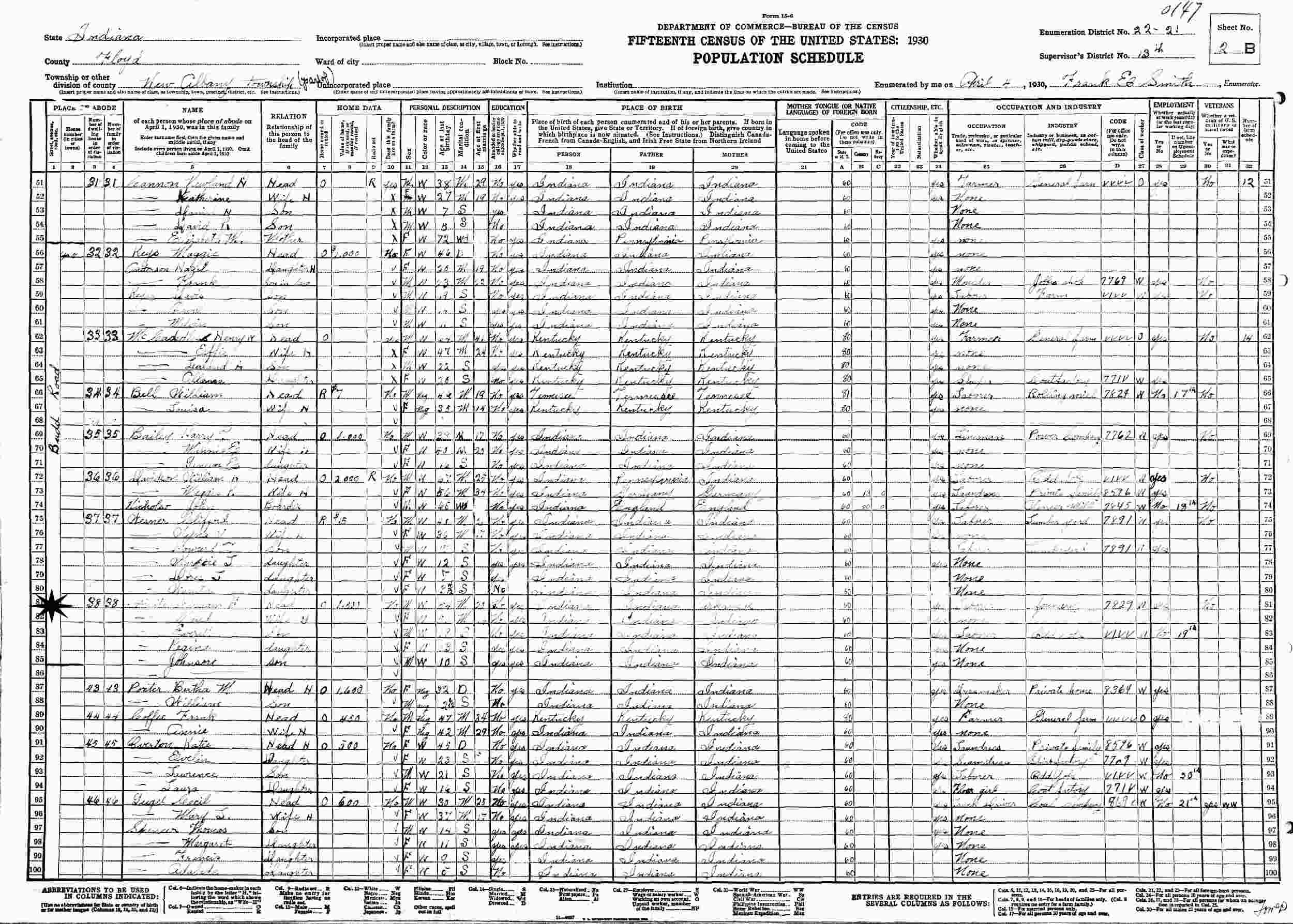 April 4, 1930 - Budd Road, Supervisor's District 13, Enumeration District 22-21, New Albany Township, Floyd County, Indiana.