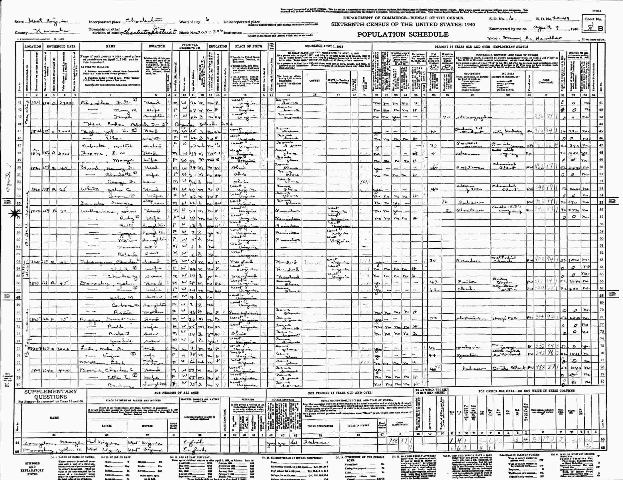 April 9, 1940 - 1802 O'Dell Avenue, Ward 6, Blocks 205-206, Supervisor's District 6, Enumeration District 20-49, Charleston Magisterial District, Kanawha County, West Virginia.