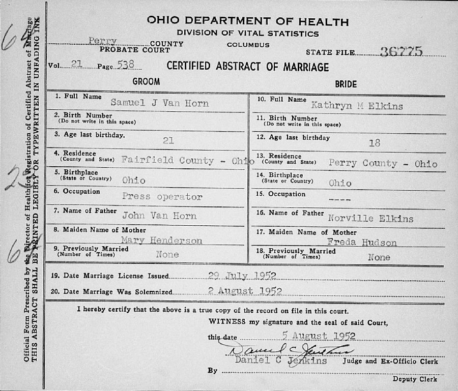 Married: Kathryn M Elkins August 2, 1952 in Perry County, Ohio.