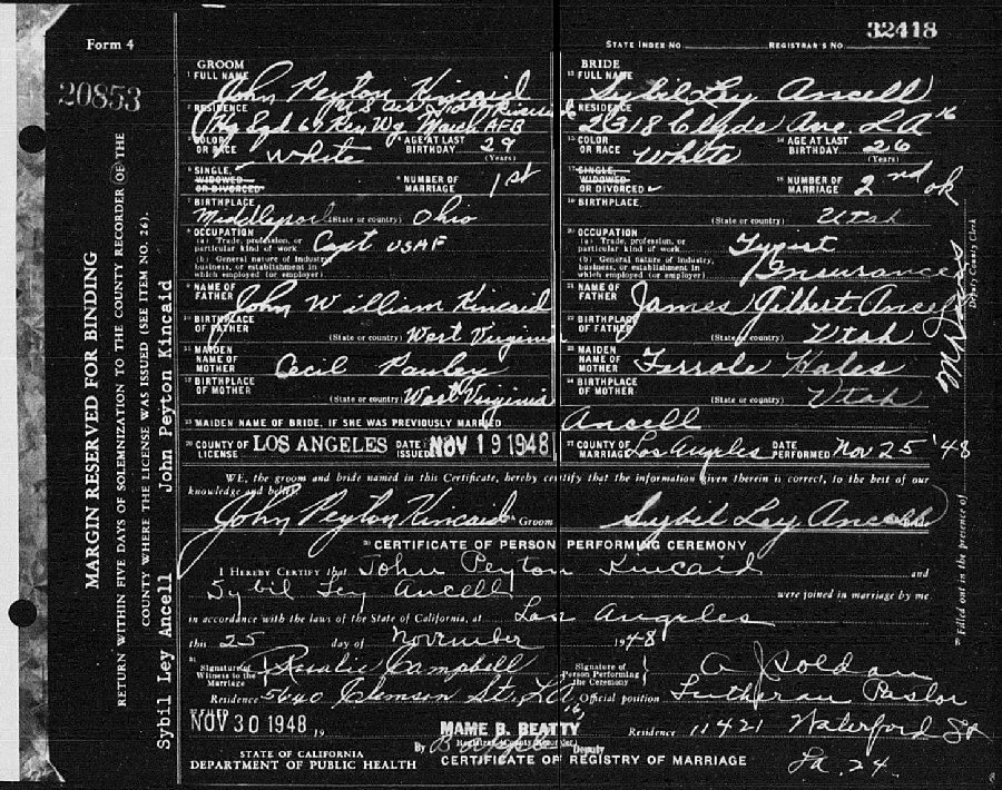 (2) John Peyton Kincaid November 25, 1948 in Westwood, Los Angeles County, California.