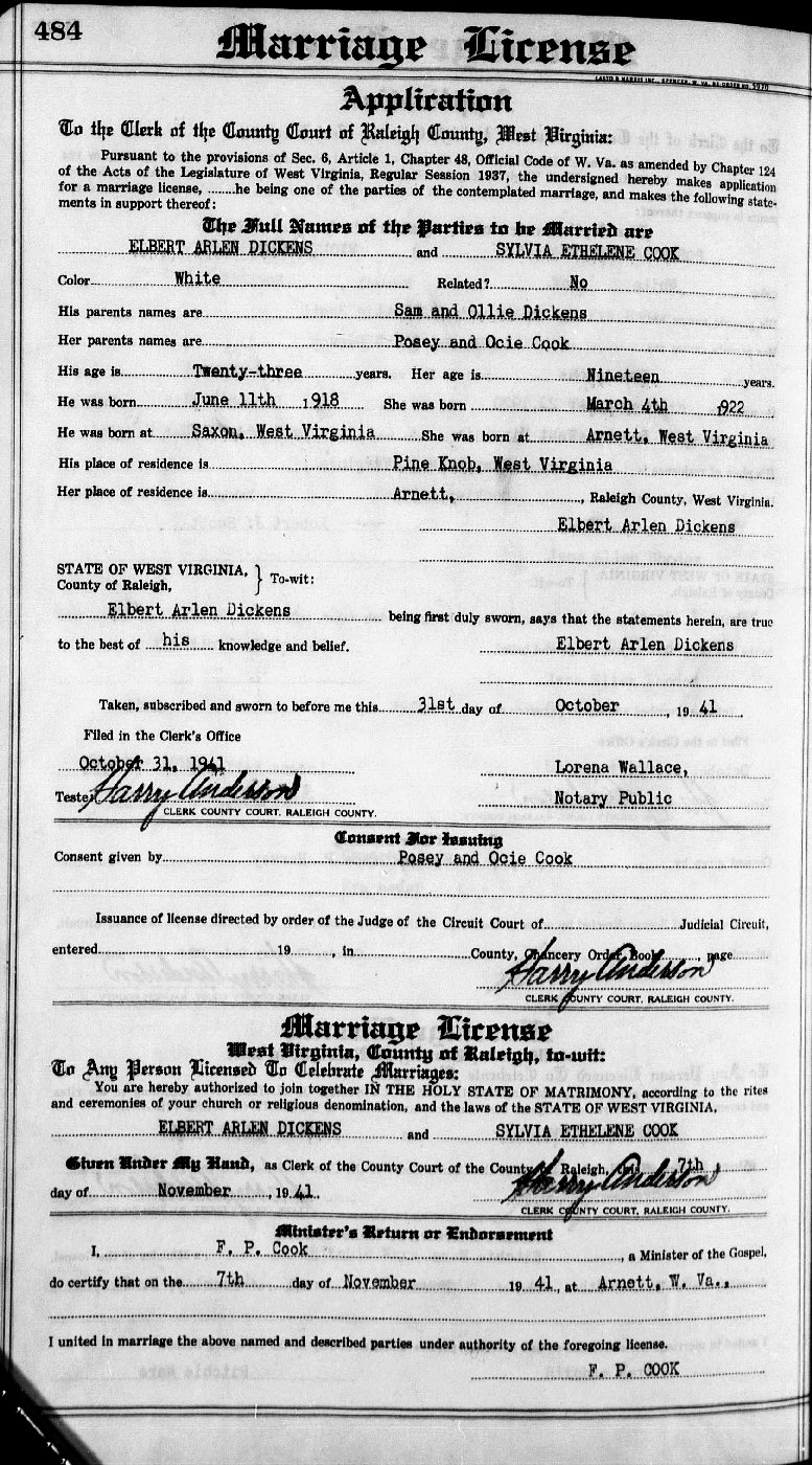 Married: (1) Elbert Arlen Dickens November 7, 1941 in Arnett, Raleigh County, West Virginia. (Divorce before 1950.) (He was b. June 11, 1918, Saxon, Raleigh County, West Virginia; d. September 13, 1989, Dayton, Montgomery County, Ohio.)