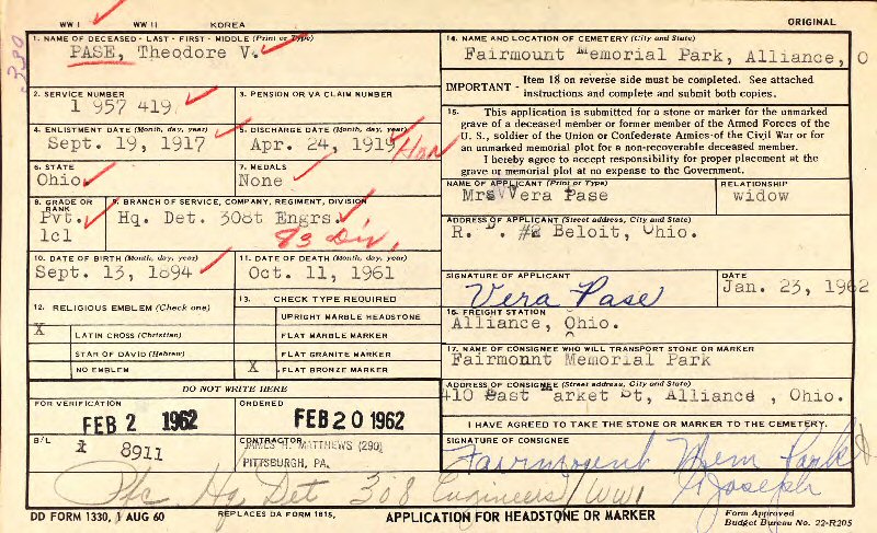 Military Service: September 19, 1917-April 24, 1919 - WWI - U.S. Army - HQ DET 308 Engineers.